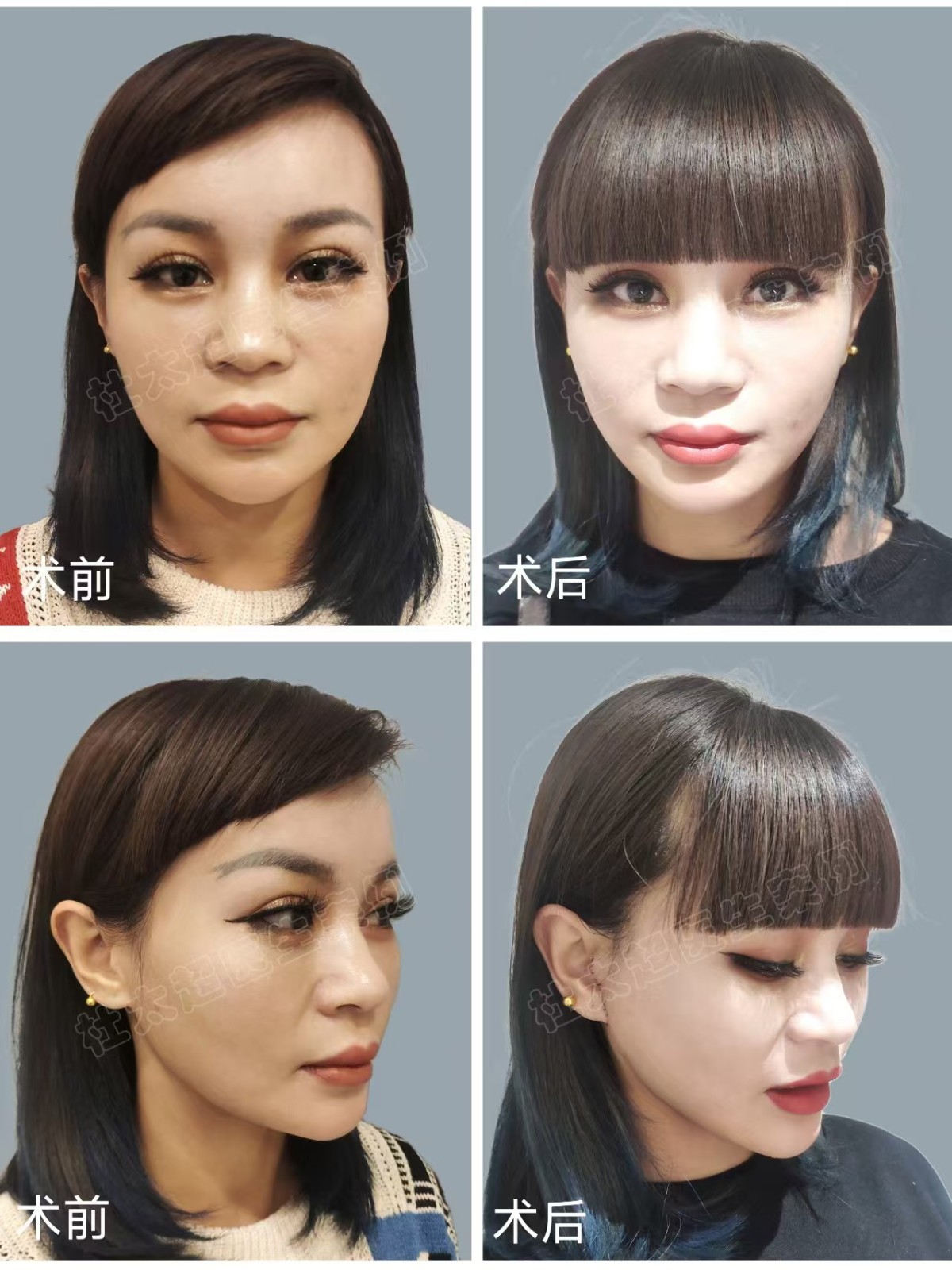 采用跳跃式小切口提升缩紧术式,切口分别设计在环耳垂位置和颞部发际线内,就近剥离,剥离范围很小,提升范围可达整个中下面部。