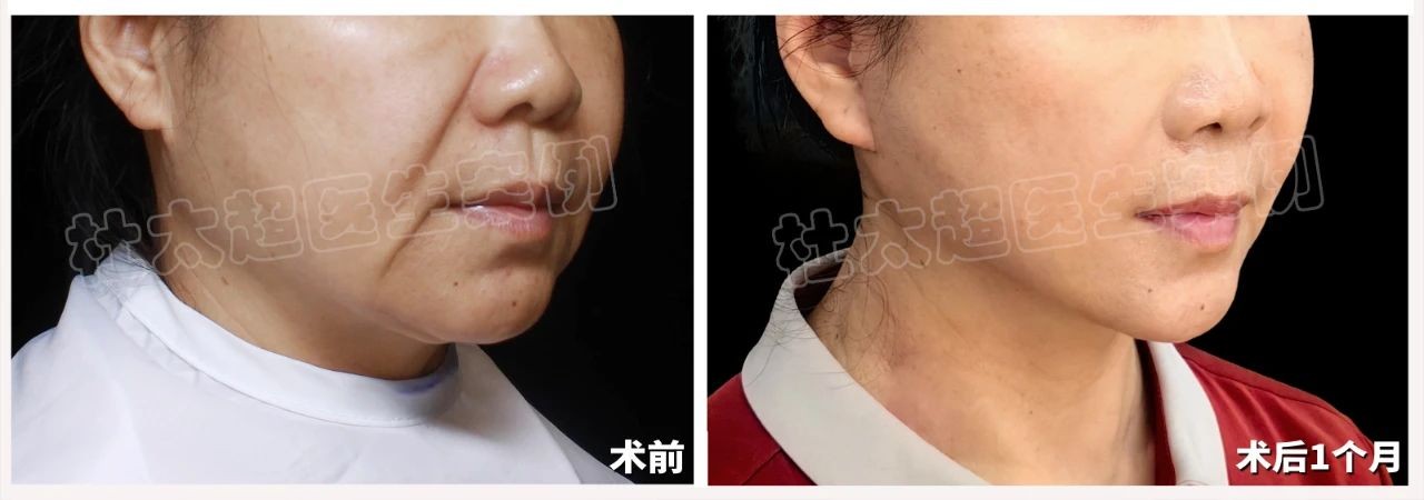 术后一个月,求美者的下颌缘紧致提升,法令纹明显淡化,嘴角囊袋也显著改善。