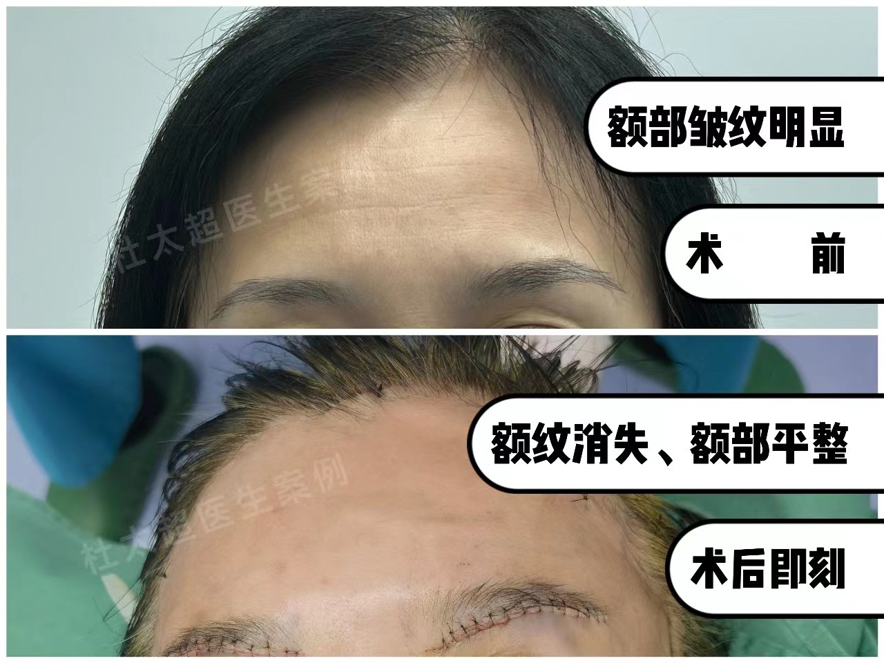 设计额部点状小切口帮她进行皱纹去除,切口位置仅仅是三个小点,分别在额中、量鬓角位置,创伤不大,改善效果明显。