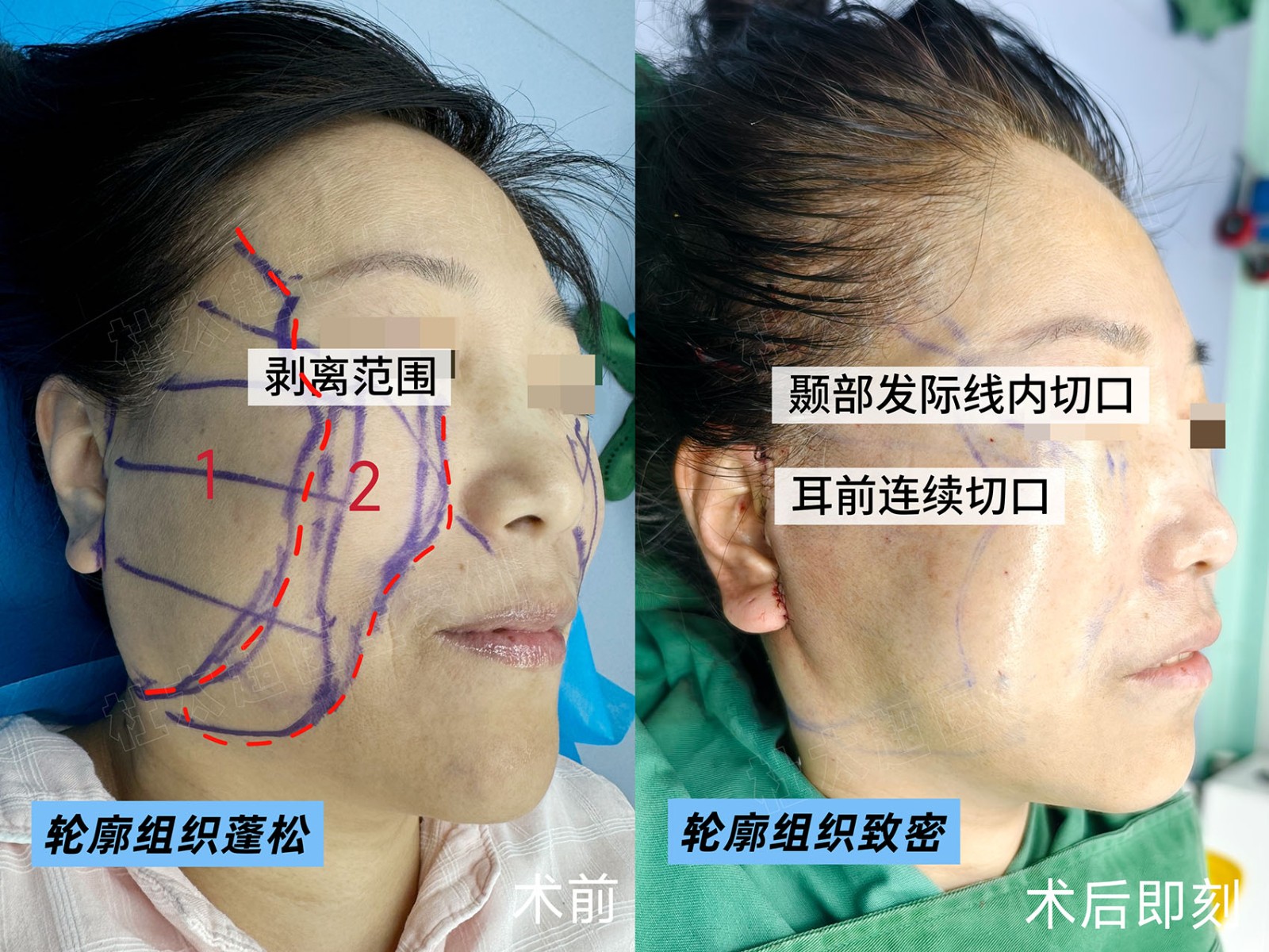 很多求美者想知道我们手术的剥离范围~就以这位求美者为例,给大家进行讲解求美者55岁,面部松弛下垂明显,面部组织蓬松,设计耳前连续切口...