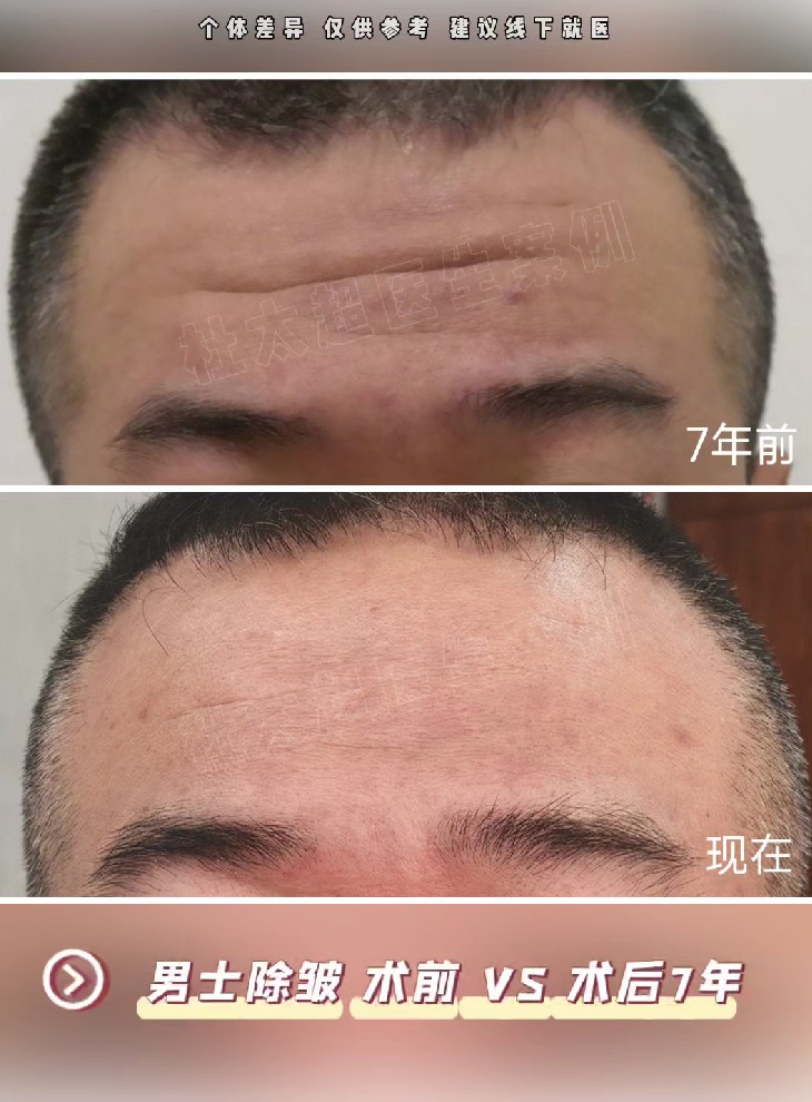 不要把手术去除额纹想象得很可怕,其实它的切口很小,三个点状小切口,在0.5cm左右,改善范围包含整个额部+眉间,术后效果很不错,终身受益...