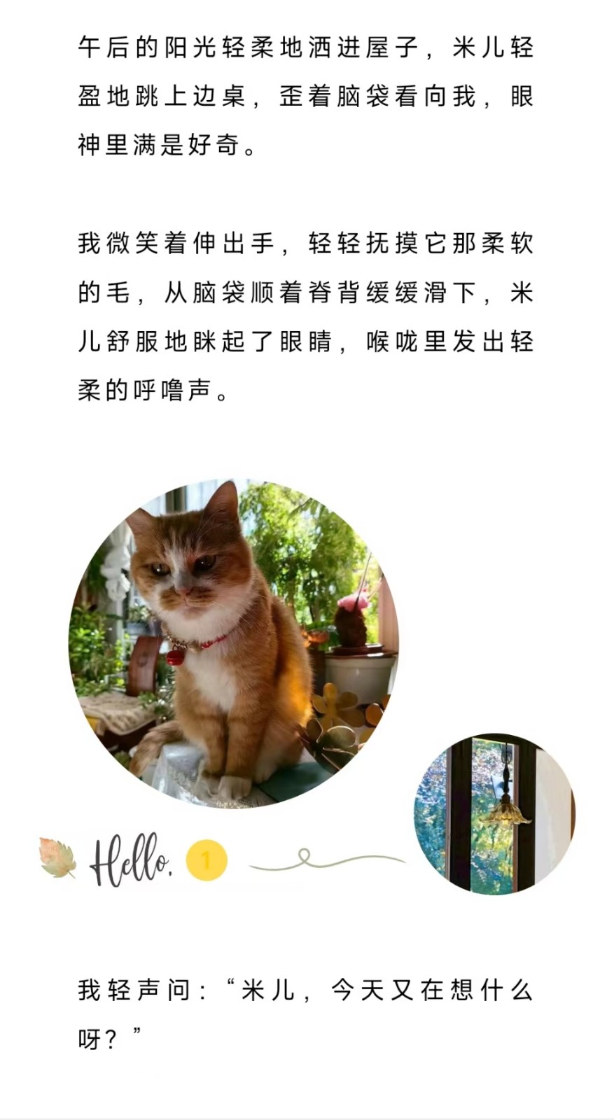 午后的阳光轻柔地洒进屋子,米儿轻盈地跳上边桌,歪着脑袋看向我,眼神里满是好奇。我微笑着伸出手,轻轻抚摸它那柔软的毛,从脑袋顺着脊背...