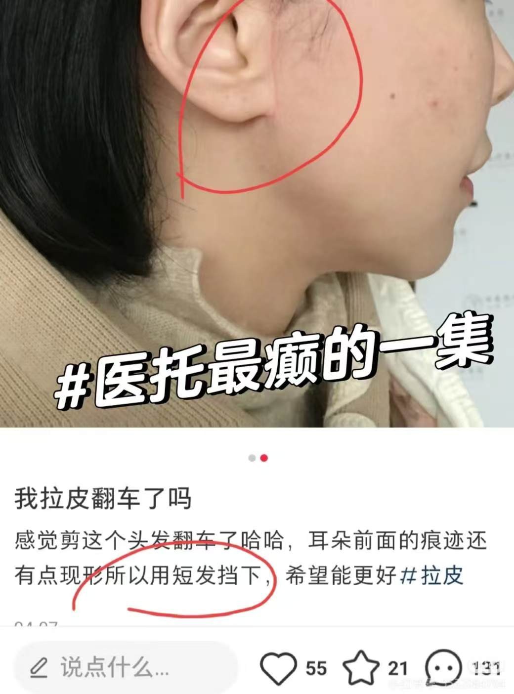 ??但凡经验丰富点的医生,都不会这样设计切口‼️拉皮缝合的再好也需要一定的恢复期,所以切口位置在设计的时候就要尽可能隐蔽,以减少求...