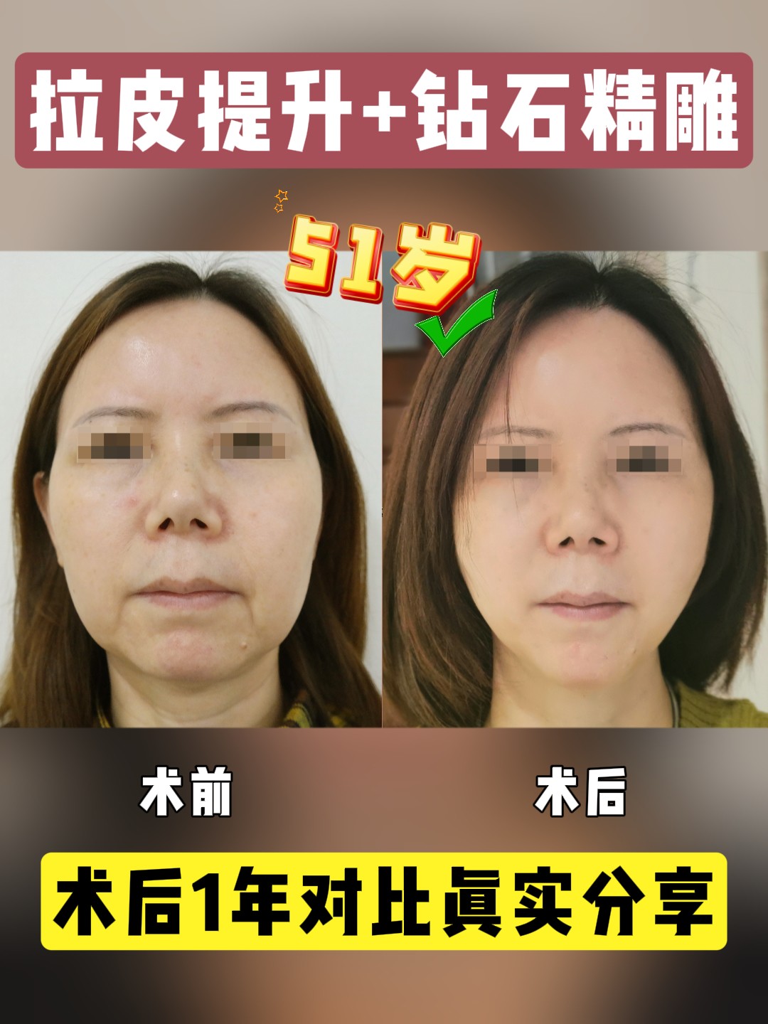这位51岁女士术前深刻的法令纹与面部的下垂让她显得沧桑。 采用caw小切口面部提升术后一年,法令纹消失,下颌线条清晰,整个面部恢复青春...
