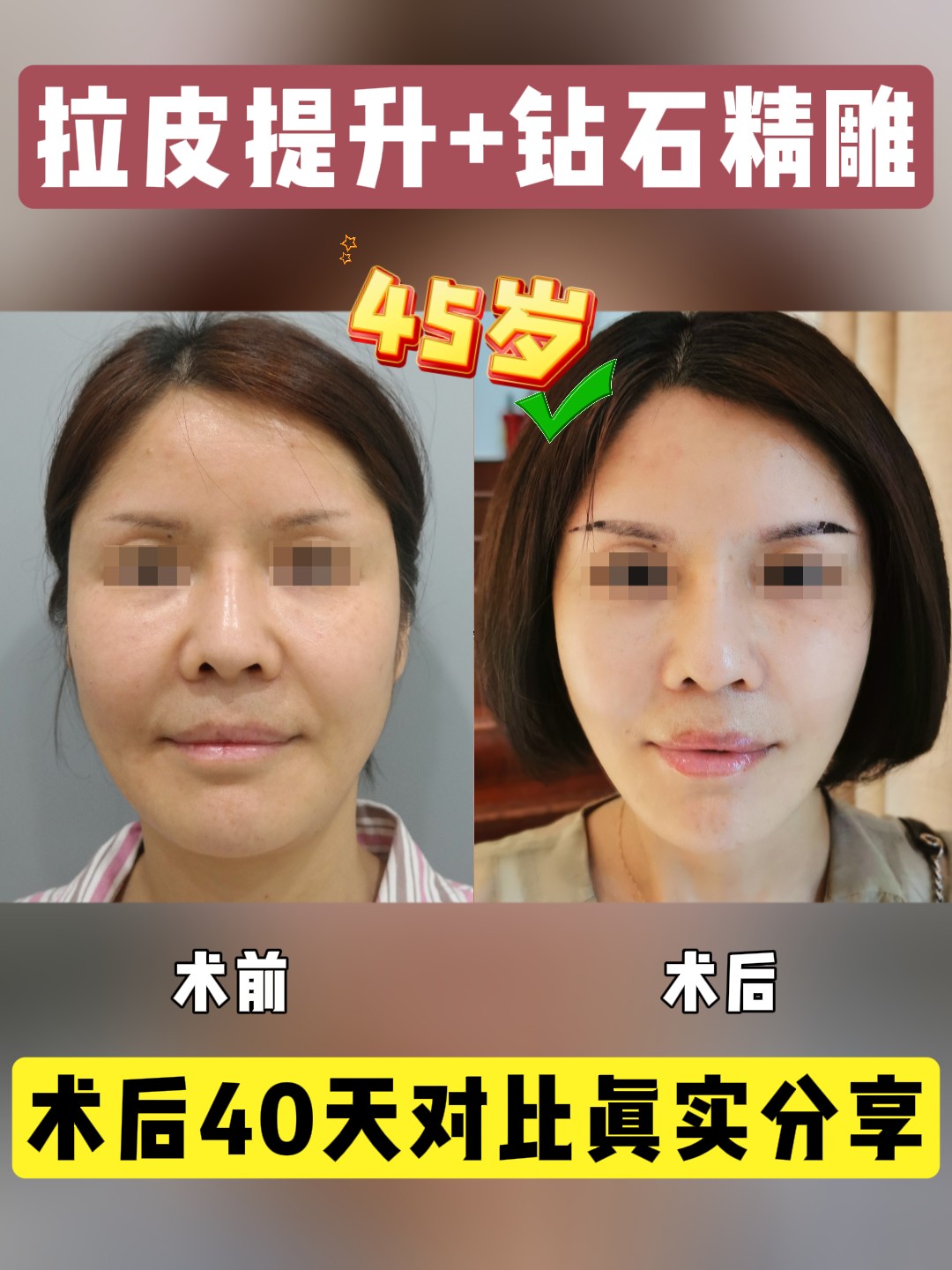 37岁的女士看起来显老,面部下垂问题曾让她无助。我们结合钻石精雕和caw小切口面部提升术给了她改变。钻石精雕刺激胶原再生,紧致皮肤;caw...