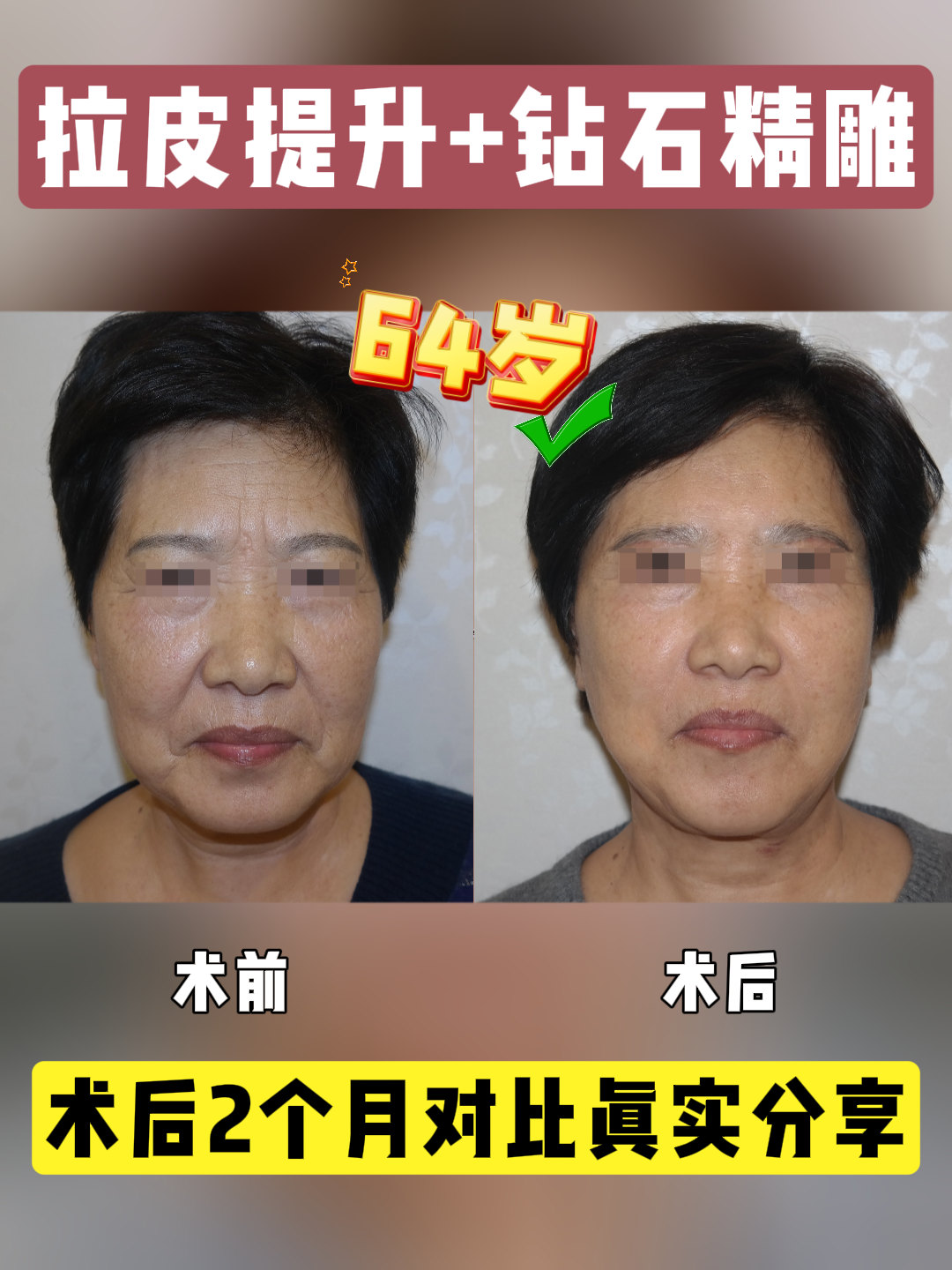 64岁求美者,经caw小切口面部提升手术,额纹、眼皮下垂、面部松弛问题得到解决,术后两个月,面部紧致,显年轻。caw小切口面部提升,切口小...