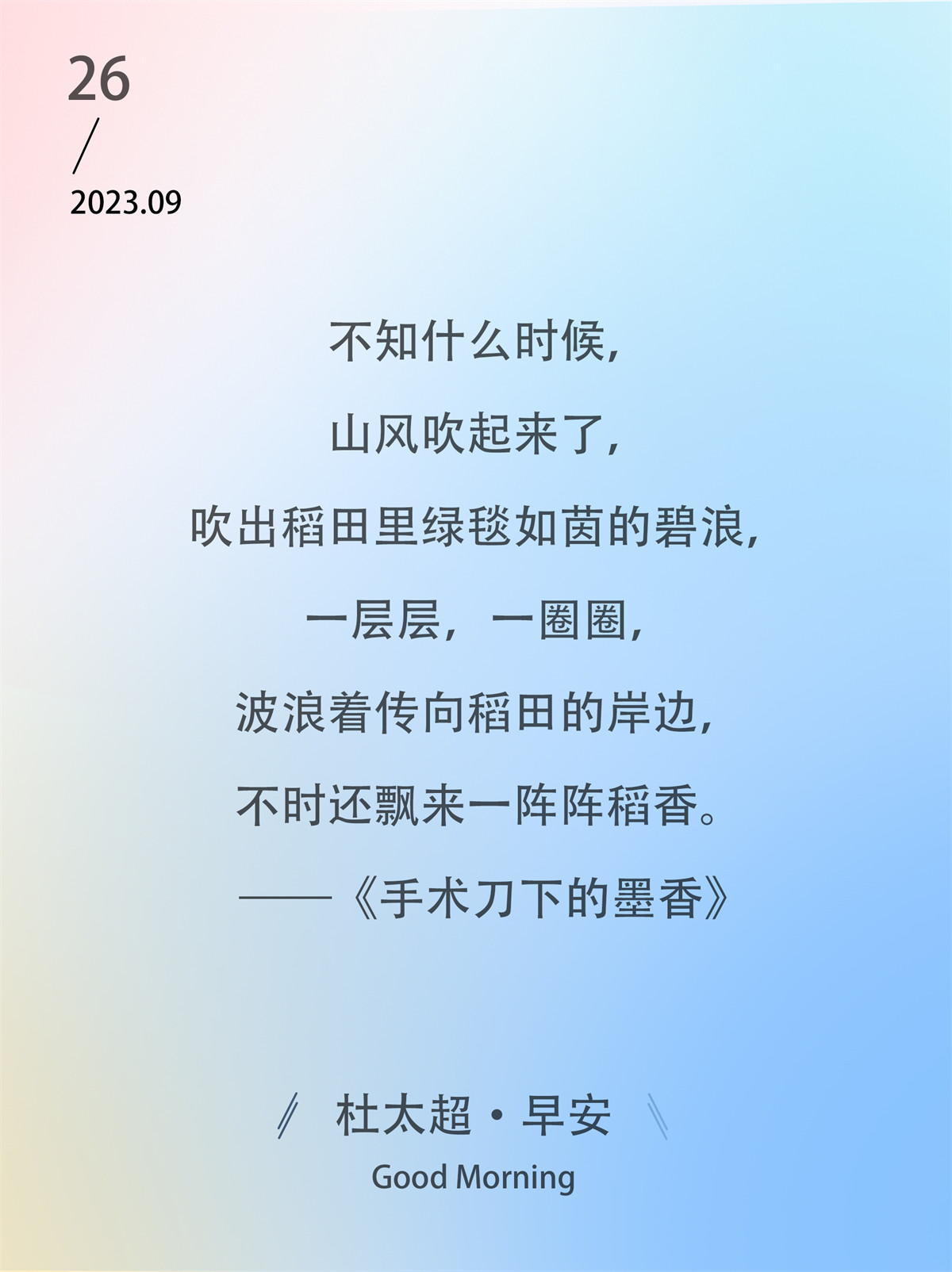 不知什么时候,山风吹起来了,吹出稻田里绿毯如茵的碧浪,一层层,一圈圈,波浪着传向稻田的岸边,不时还飘来一阵阵稻香。——《手术刀下的墨香》