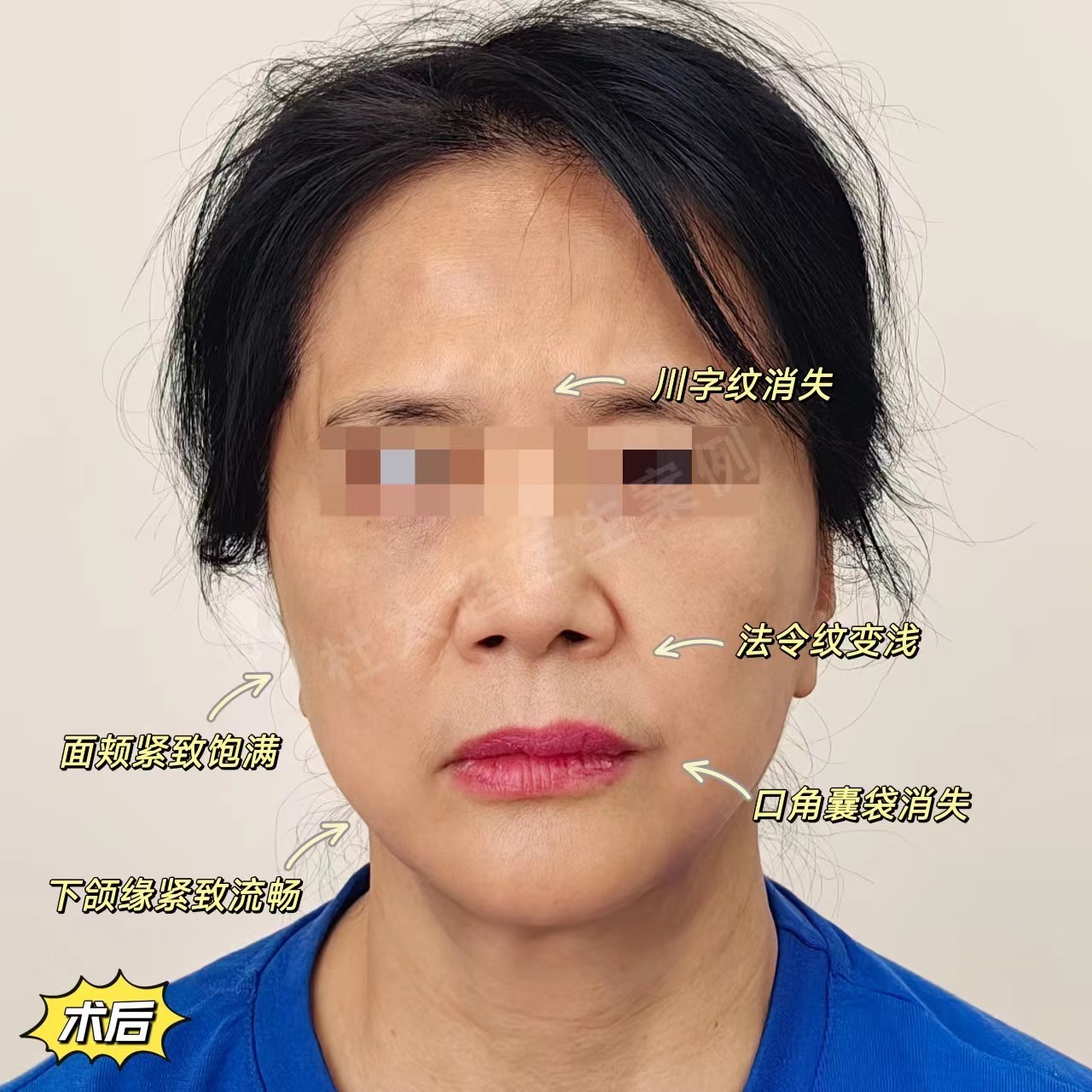 她的面部问题主要是软组织的整体松垂,面部已经出现塌陷和软组织堆积,主要集中在下面部。