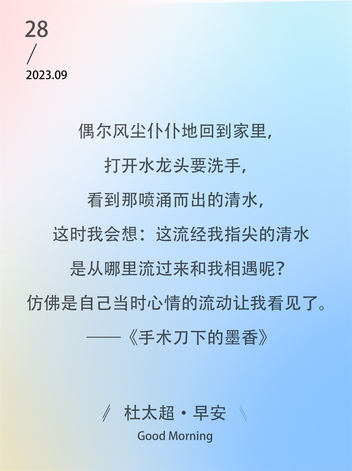 偶尔风尘仆仆地回到家里,打开水龙头要洗手,看到那喷涌而出的清水,这时我会想:这流经我指尖的清水是从哪里流过来和我相遇呢?仿佛是自己当时心情的流动让我看见了。——《手术刀下的墨香》