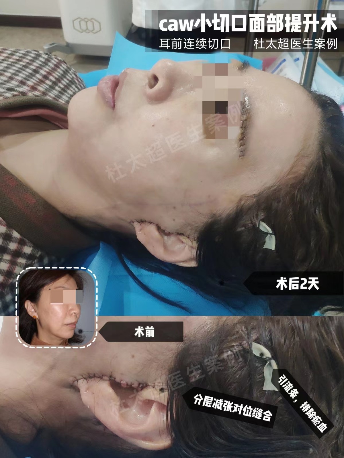 2、连续切口,适合面部中重度衰老人群,切口约10cm,术后建议在院留观3天~