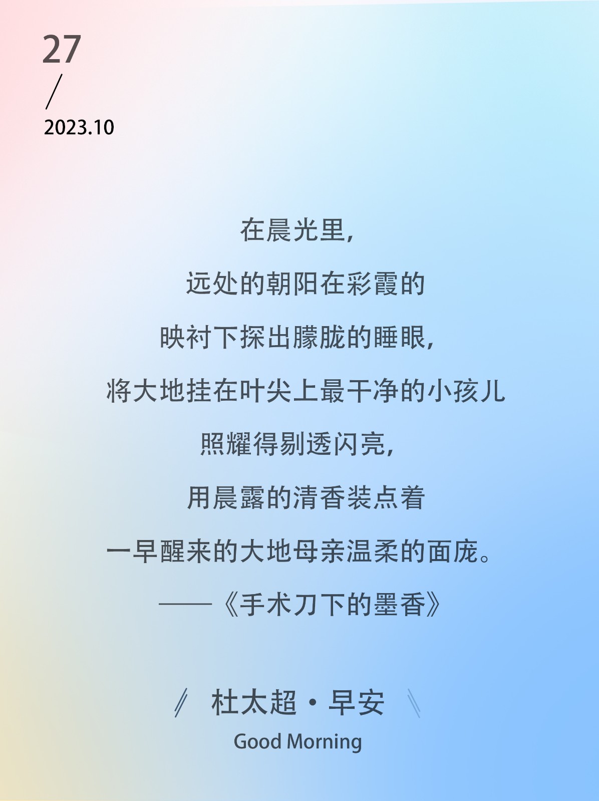在晨光里,远处的朝阳在彩霞的映衬下探出朦胧的睡眼,将大地挂在叶尖上最干净的小孩儿照耀得剔透闪亮,用晨露的清香装点着一早醒来的大地母亲温柔的面庞。