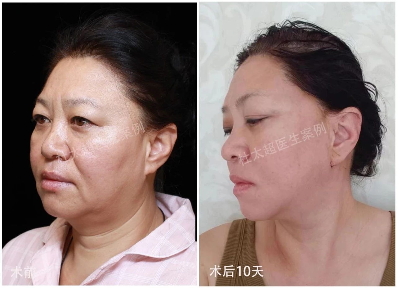 图中求美者50岁+,做了拉皮手术提升下颌缘轮廓,切口在耳垂皱壁内,通过对耳垂周进行小范围剥离后,对smas筋膜进行环形悬吊提升,提拉筋膜到原本的位置,带动皮肤层上提,最后去除适量多余皮肤缝合,恢复后切口隐蔽无疤痕,完全看不到手术痕迹,且提升效果明显。