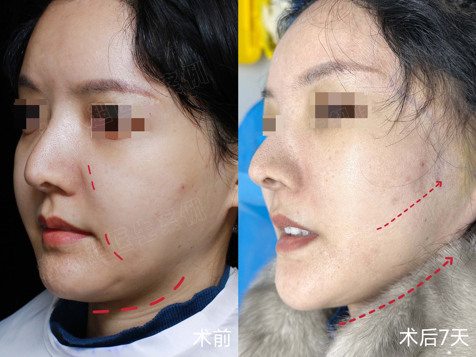 这位求美者32岁,之前做过线雕,面部轻度凹陷,组织蓬松,轮廓松弛模糊。通过颞部切口提升面部,术后7天,面部整体上提,纹路减轻,轮廓立...