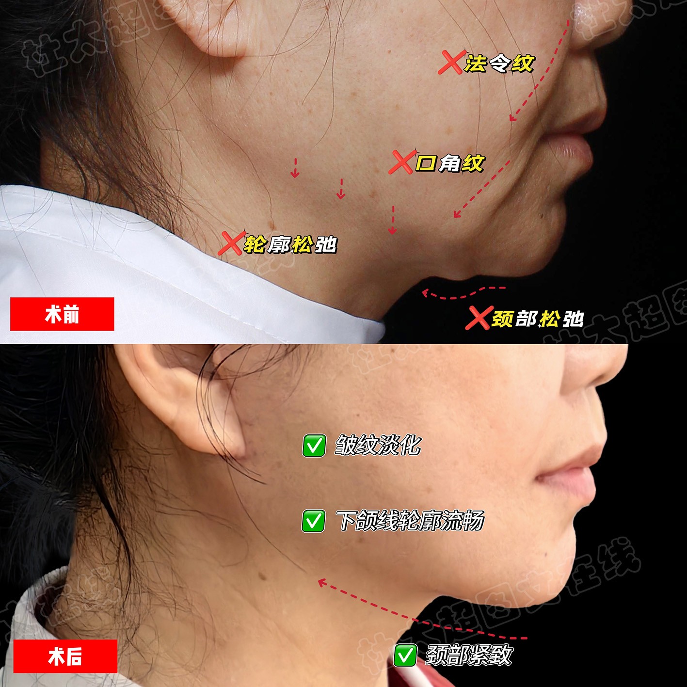 钻石精雕辅助拉皮提升下面部轮廓的真实案例,还原紧致流畅的侧颜轮廓线条,实现1+1>2的效果。