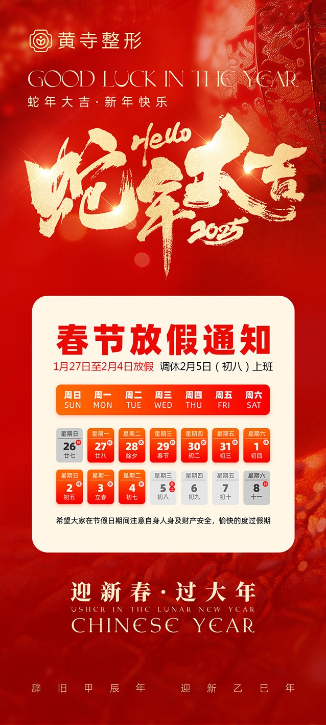 春节假期通知我们将于1月27日到2月4日全院休假感谢大家一年来的支持与厚爱!祝大家蛇年大吉,财运亨通,步步高升!