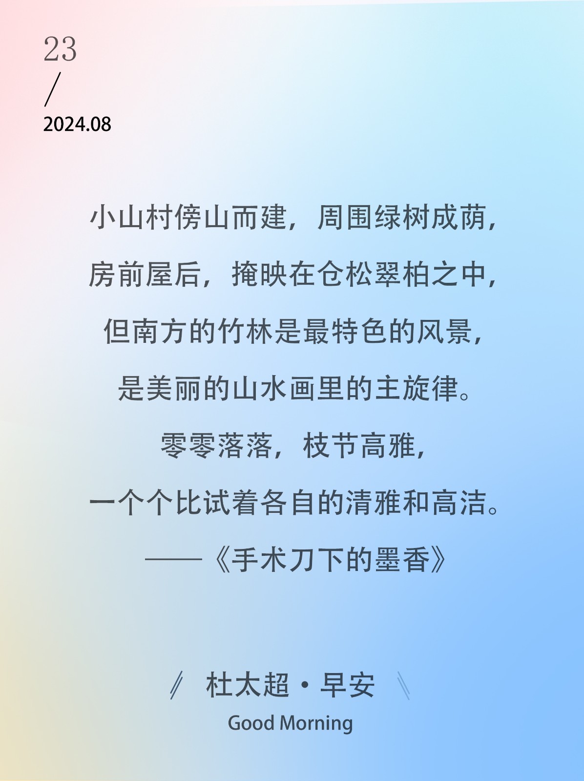 小山村傍山而建,周围绿树成荫,房前屋后,掩映在仓松翠柏之中,但南方的竹林是最特色的风景,是美丽的山水画里的主旋律。零零落落,枝节高...