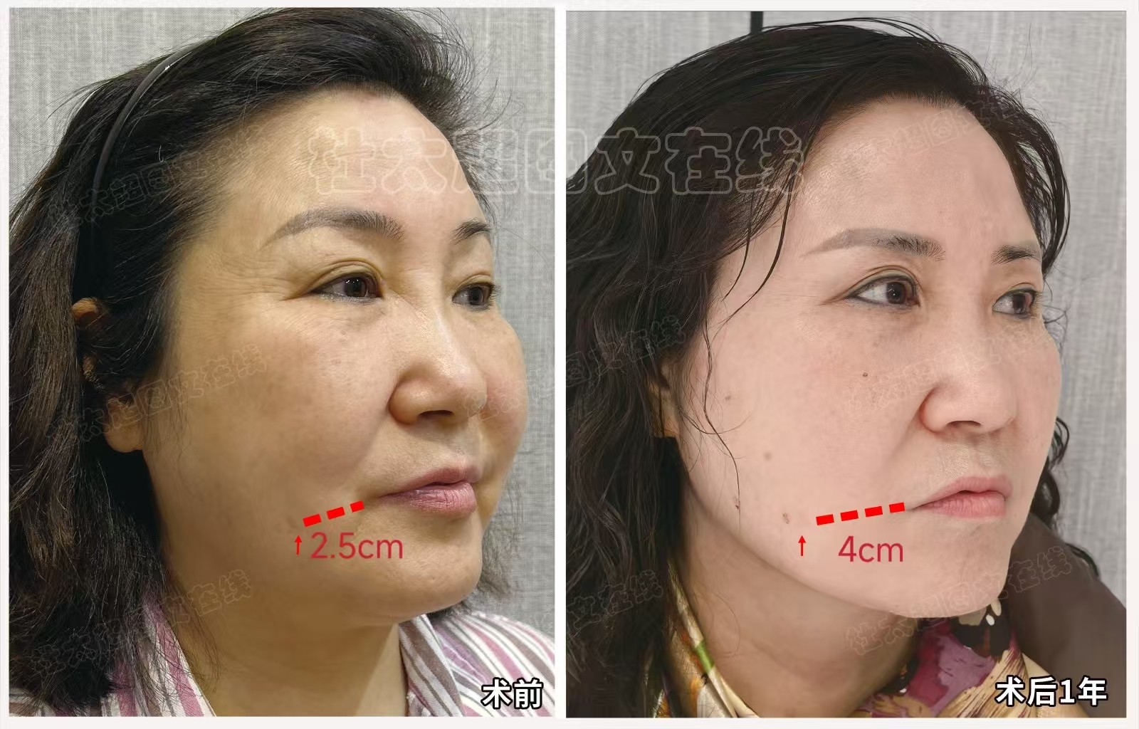 拉皮提升缩紧术后1年对比下颌缘轮廓得到提升,术后轮廓变流畅,中面部变饱满,下面部组织堆积得到解决