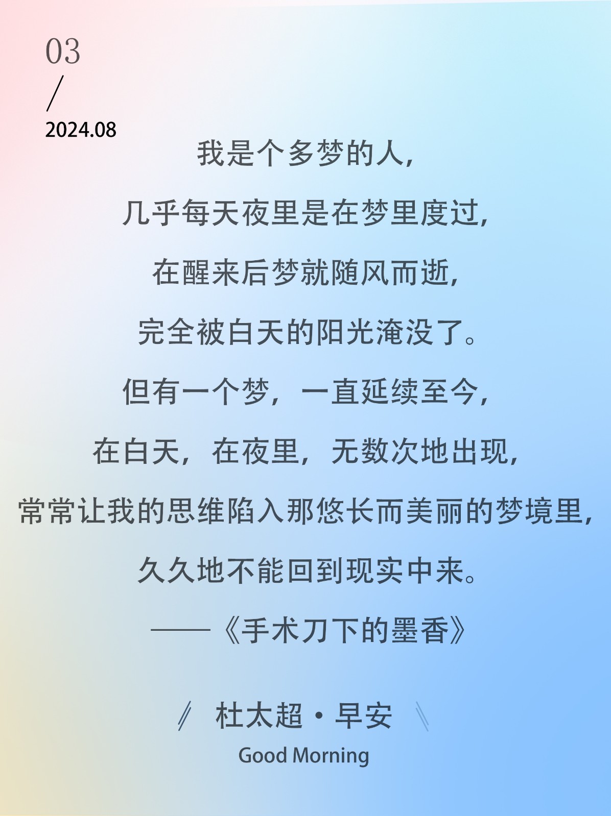 我是个多梦的人,几乎每天夜里是在梦里度过,在醒来后梦就随风而逝,完全被白天的阳光淹没了。但有一个梦,一直延续至今,在白天,在夜里,...