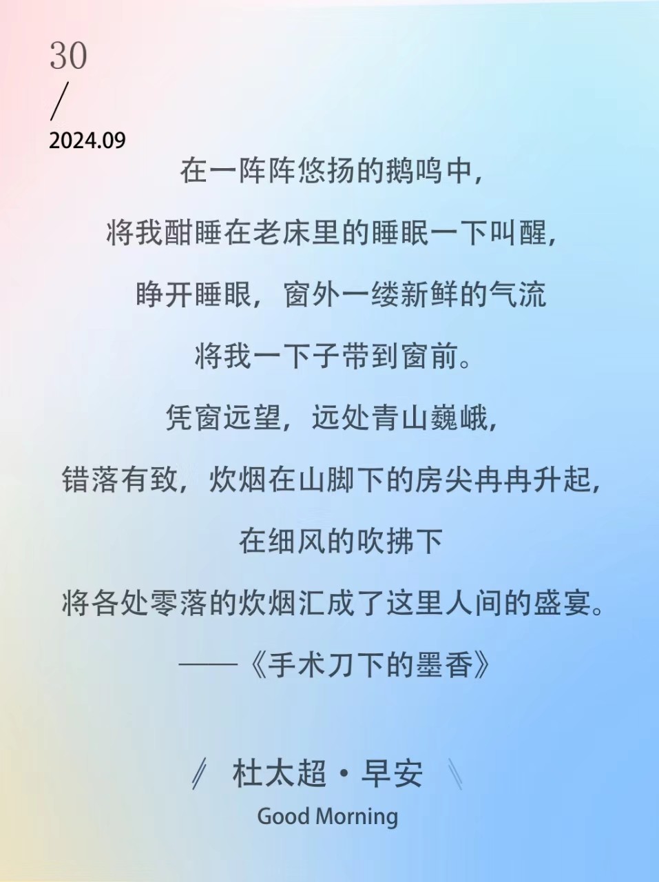 在一阵阵悠扬的鹅鸣中,将我酣睡在老床里的睡眠一下叫醒,睁开睡眼,窗外一缕新鲜的气流将我一下子带到窗前。凭窗远望,远处青山巍峨,错落...