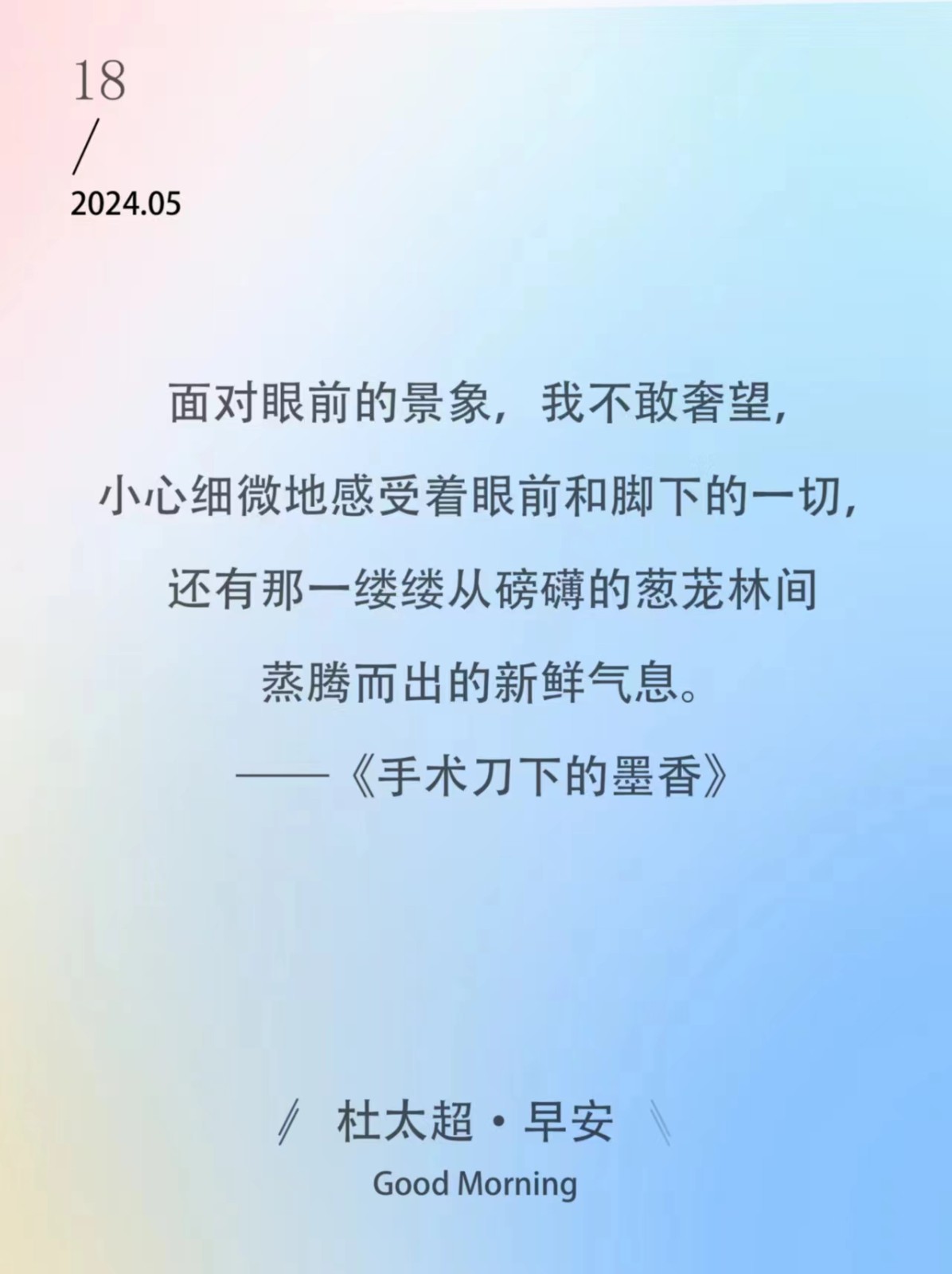 面对眼前的景象,我不敢奢望,小心细微地感受着眼前和脚下的一切,还有那一缕缕从磅礴的葱茏林间蒸腾而出的新鲜气息。——《手术刀下的墨香》