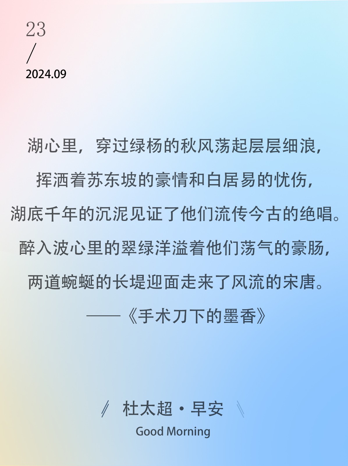 湖心里,穿过绿杨的秋风荡起层层细浪,挥洒着苏东坡的豪情和白居易的忧伤,湖底千年的沉泥见证了他们流传今古的绝唱。醉入波心里的翠绿洋溢...