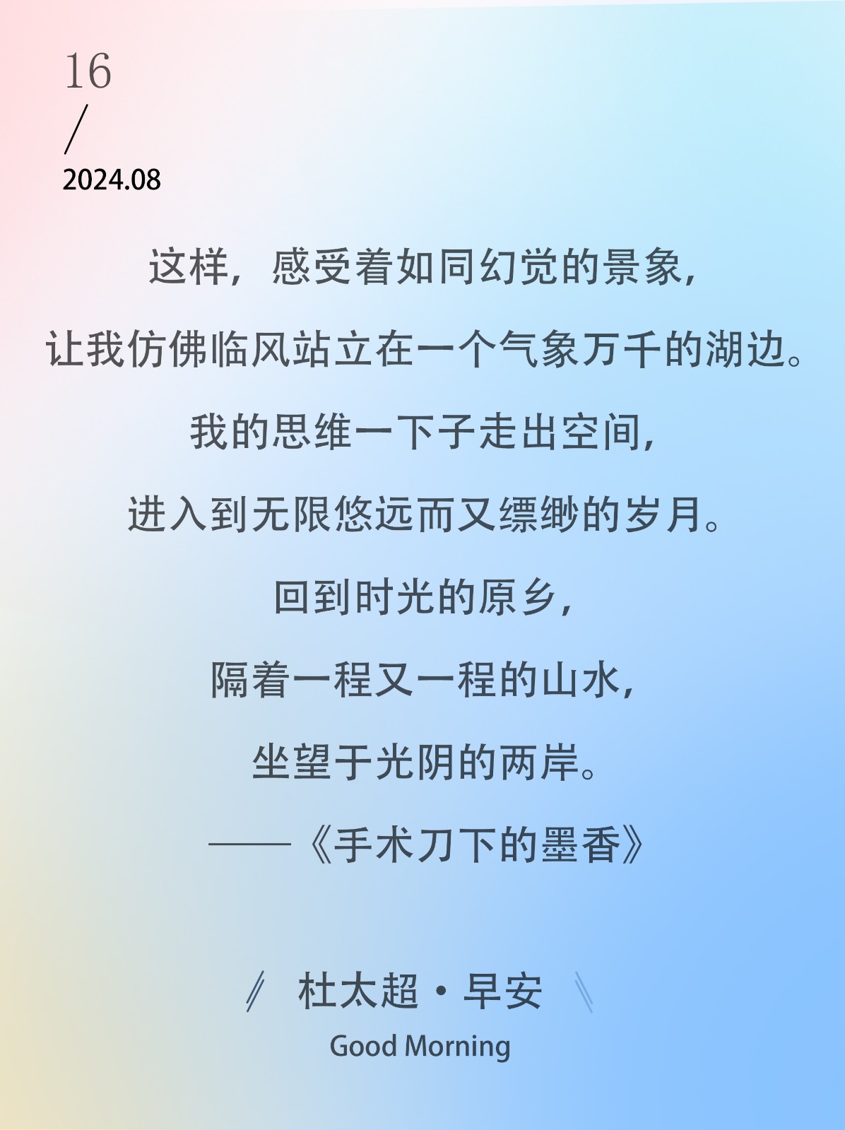 这样,感受着如同幻觉的景象,让我仿佛临风站立在一个气象万千的湖边。我的思维一下子走出空间,进入到无限悠远而又缥缈的岁月。回到时光的...