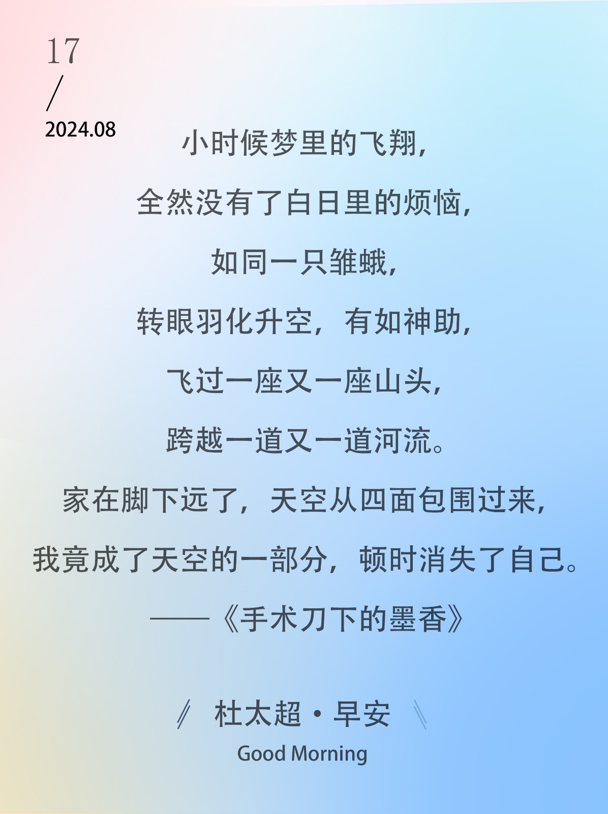小时候梦里的飞翔,全然没有了白日里的烦恼,如同一只雏蛾,转眼羽化升空,有如神助,飞过一座又一座山头,跨越一道又一道河流。家在脚下远...