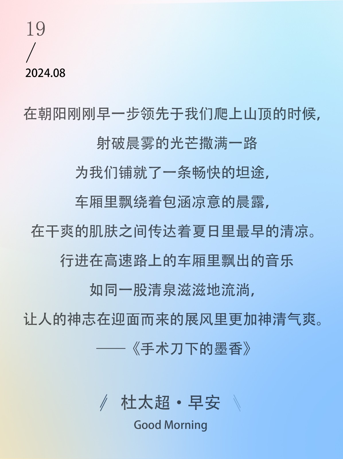 在朝阳刚刚早一步领先于我们爬上山顶的时候,射破晨雾的光芒撒满一路为我们铺就了一条畅快的坦途,车厢里飘绕着包涵凉意的晨露,在干爽的肌...