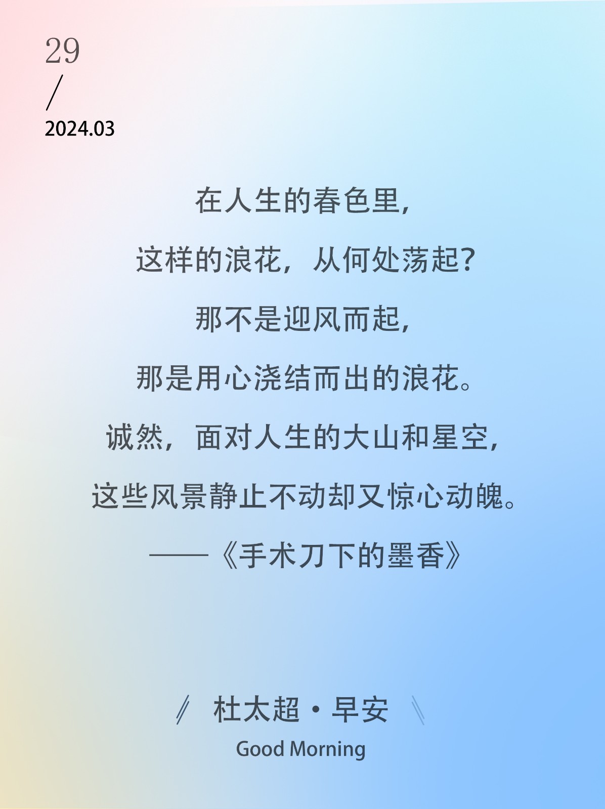 行前的湖面是繁忙的,热闹的,仿佛人声鼎沸的驿站和拥挤不堪送别的码头,在不安和失落中,带着暗暗的乡愁。——《手术刀下的墨香》