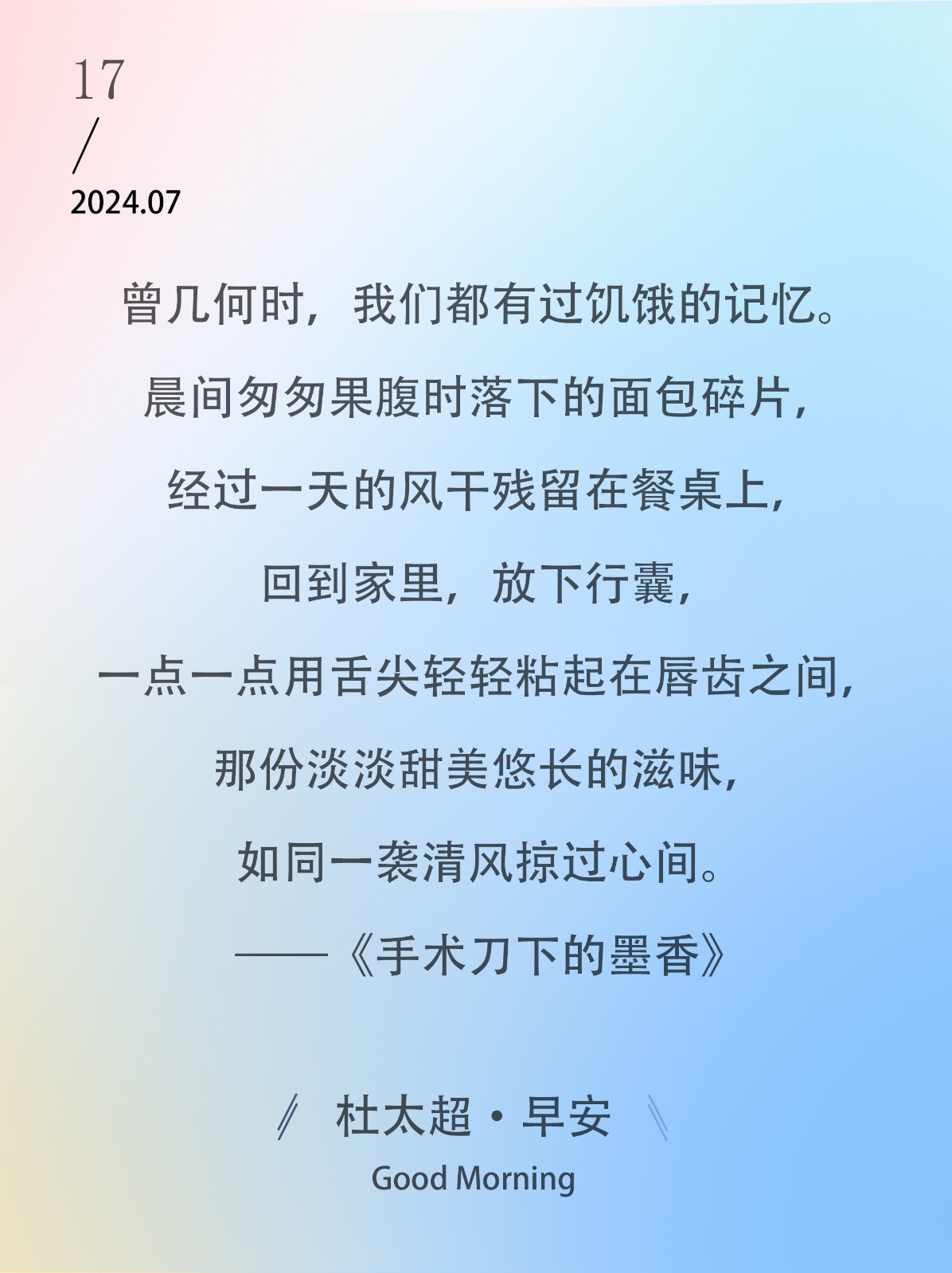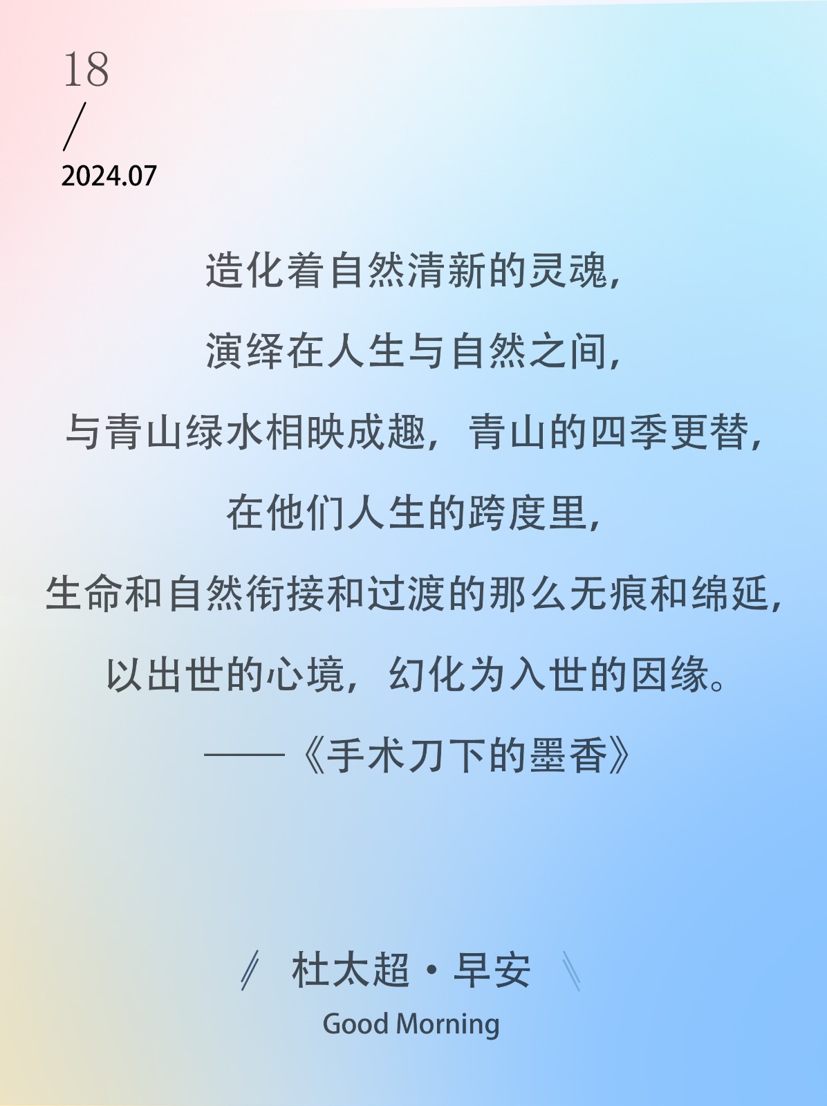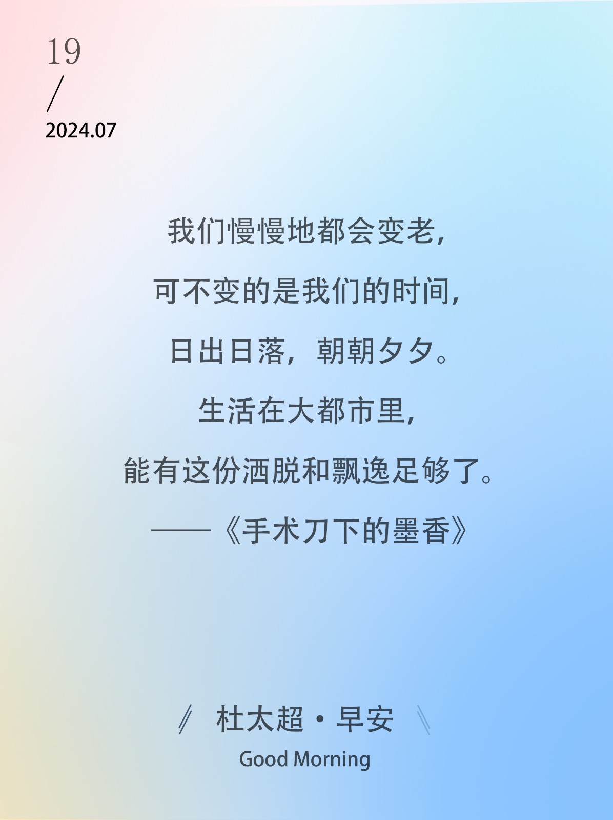 我们慢慢地都会变老,可不变的是我们的时间,日出日落,朝朝夕夕。生活在大都市里,能有这份洒脱和飘逸足够了。——《手术刀下的墨香》