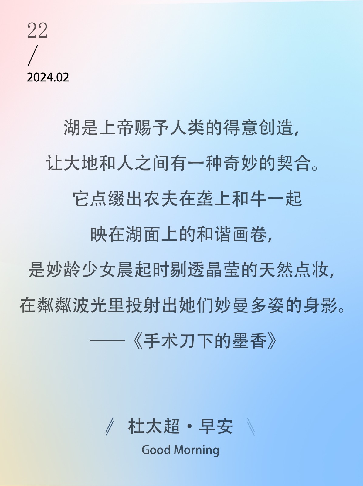 湖是上帝赐予人类的得意创造,让大地和人之间有一种奇妙的契合。它点缀出农夫在垄上和牛一起映在湖面上的和谐画卷,是妙龄少女晨起时剔透晶...