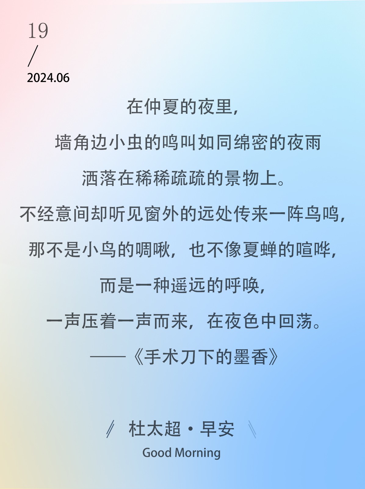 在仲夏的夜里,墙角边小虫的鸣叫如同绵密的夜雨洒落在稀稀疏疏的景物上。不经意间却听见窗外的远处传来一阵鸟鸣,那不是小鸟的啁啾,也不像...