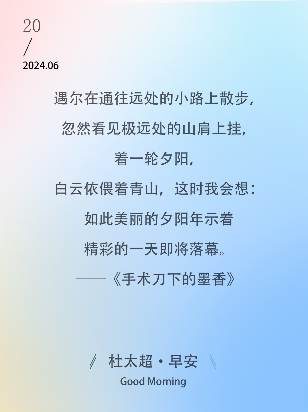 遇尔在通往远处的小路上散步,忽然看见极远处的山肩上挂,着一轮夕阳,白云依偎着青山,这时我会想:如此美丽的夕阳年示着精彩的一天即将落...