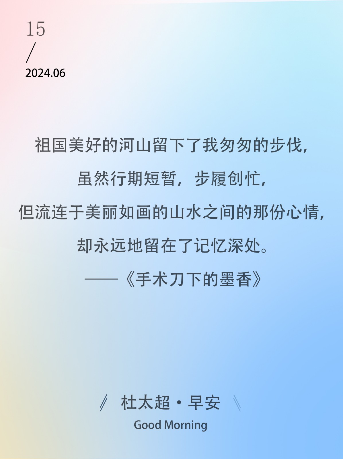 祖国美好的河山留下了我匆匆的步伐,虽然行期短暂,步履创忙,但流连于美丽如画的山水之间的那份心情,却永远地留在了记忆深处。——《手术...