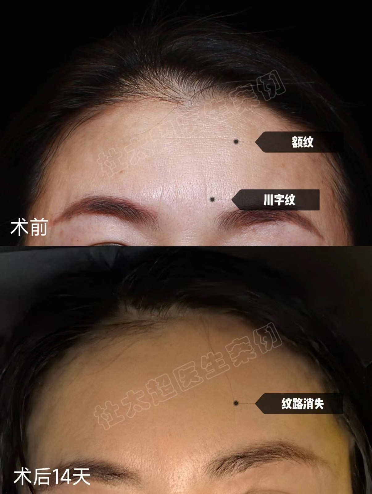 caw小切口除皱,隐蔽切口,恢复快,可根治额外、川字纹,图为术后14天恢复效果。