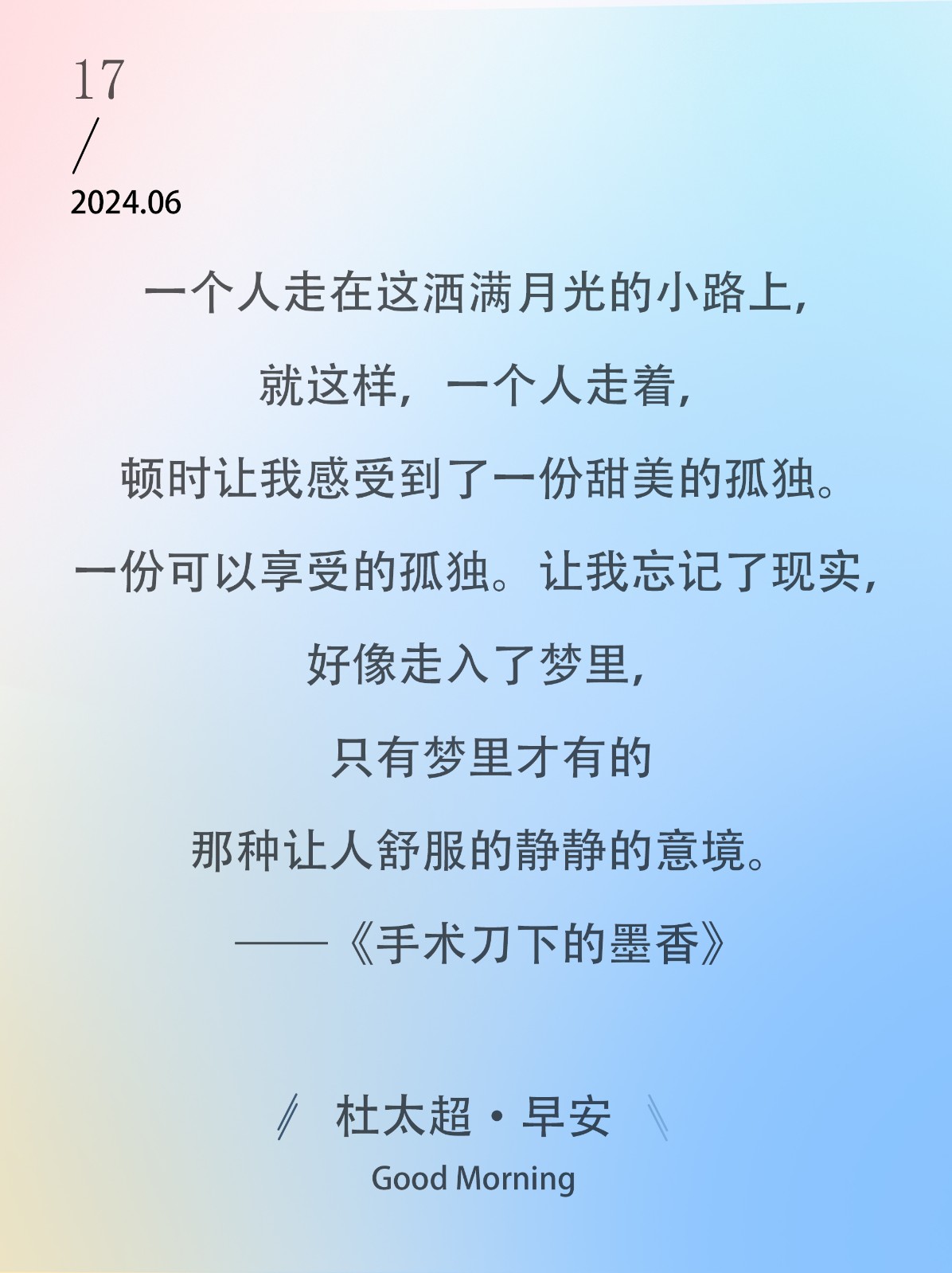 一个人走在这洒满月光的小路上,就这样,一个人走着,顿时让我感受到了一份甜美的孤独。一份可以享受的孤独。让我忘记了现实,好像走入了梦...