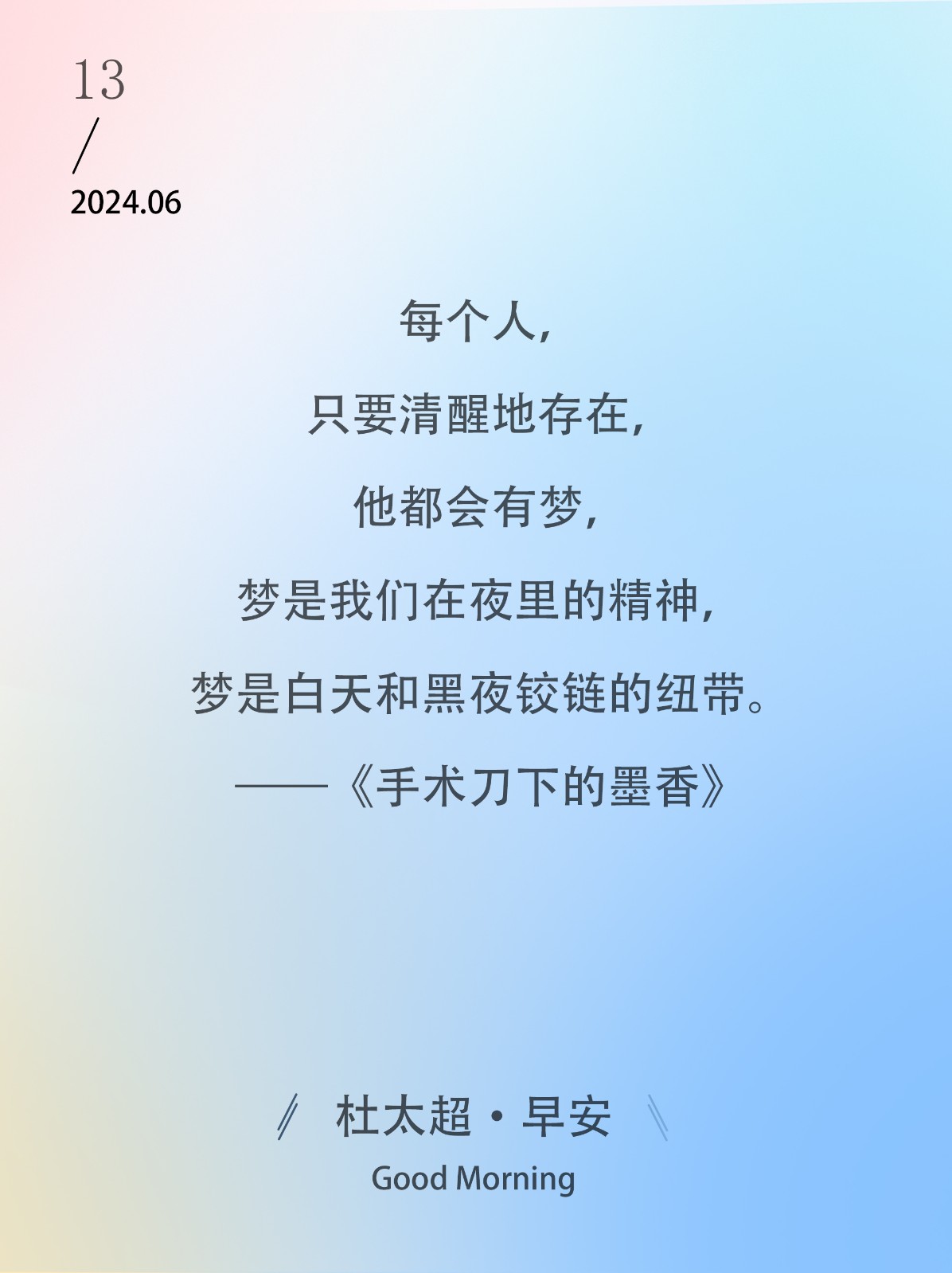 每个人,只要清醒地存在,他都会有梦,梦是我们在夜里的精神,梦是白天和黑夜铰链的纽带。——《手术刀下的墨香》