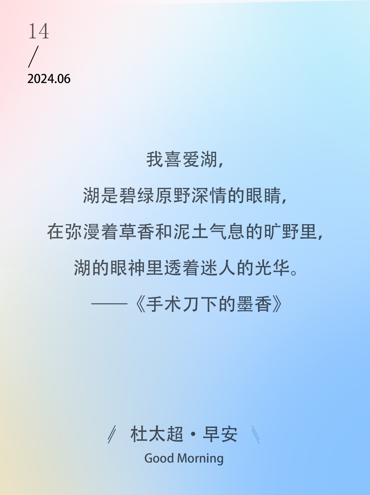 我喜爱湖,湖是碧绿原野深情的眼睛,在弥漫着草香和泥土气息的旷野里,湖的眼神里透着迷人的光华。——《手术刀下的墨香》