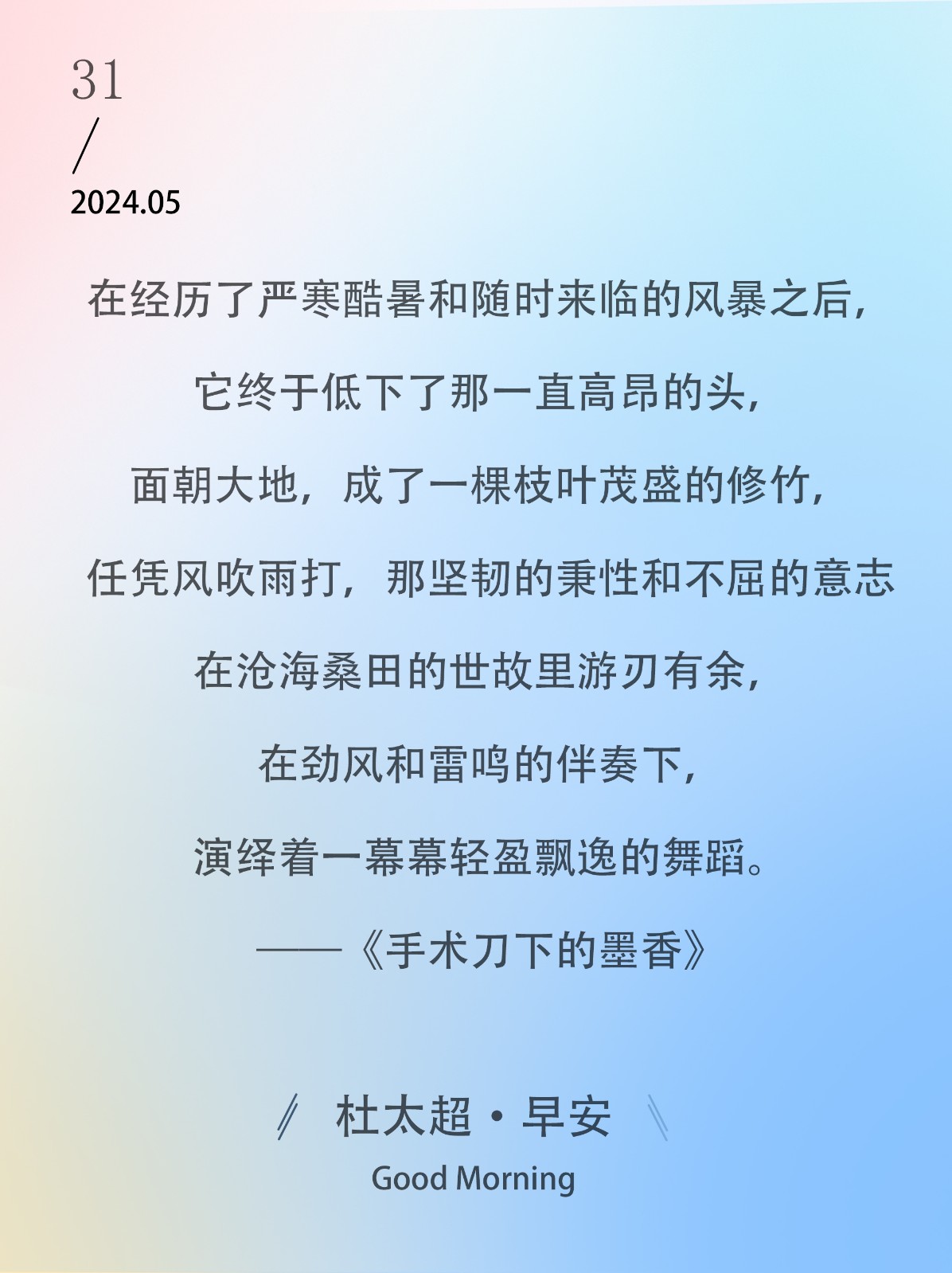 在经历了严寒酷暑和随时来临的风暴之后,它终于低下了那一直高昂的头,面朝大地,成了一棵枝叶茂盛的修竹,任凭风吹雨打,那坚韧的秉性和不...