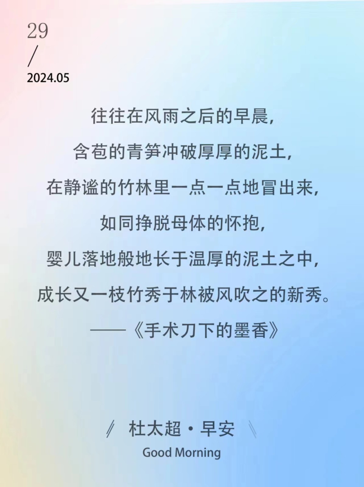 往往在风雨之后的早晨,含苞的青笋冲破厚厚的泥土,在静谧的竹林里一点一点地冒出来,如同挣脱母体的怀抱,婴儿落地般地长于温厚的泥土之中...