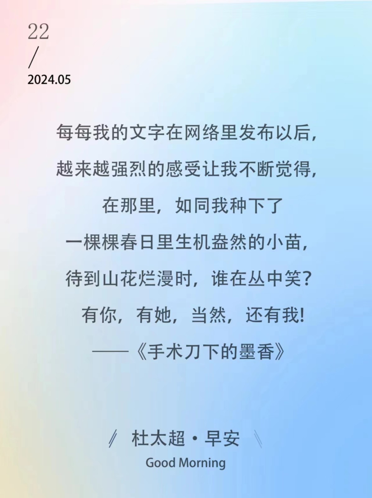 每每我的文字在网络里发布以后,越来越强烈的感受让我不断觉得,在那里,如同我种下了一棵棵春日里生机盎然的小苗,待到山花烂漫时,谁在丛...