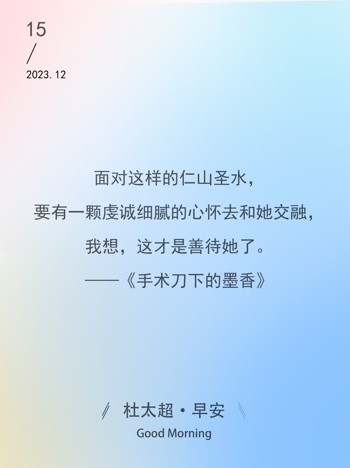 面对这样的仁山圣水,要有一颗虔诚细腻的心怀去和她交融,我想,这才是善待她了。——《手术刀下的墨香》