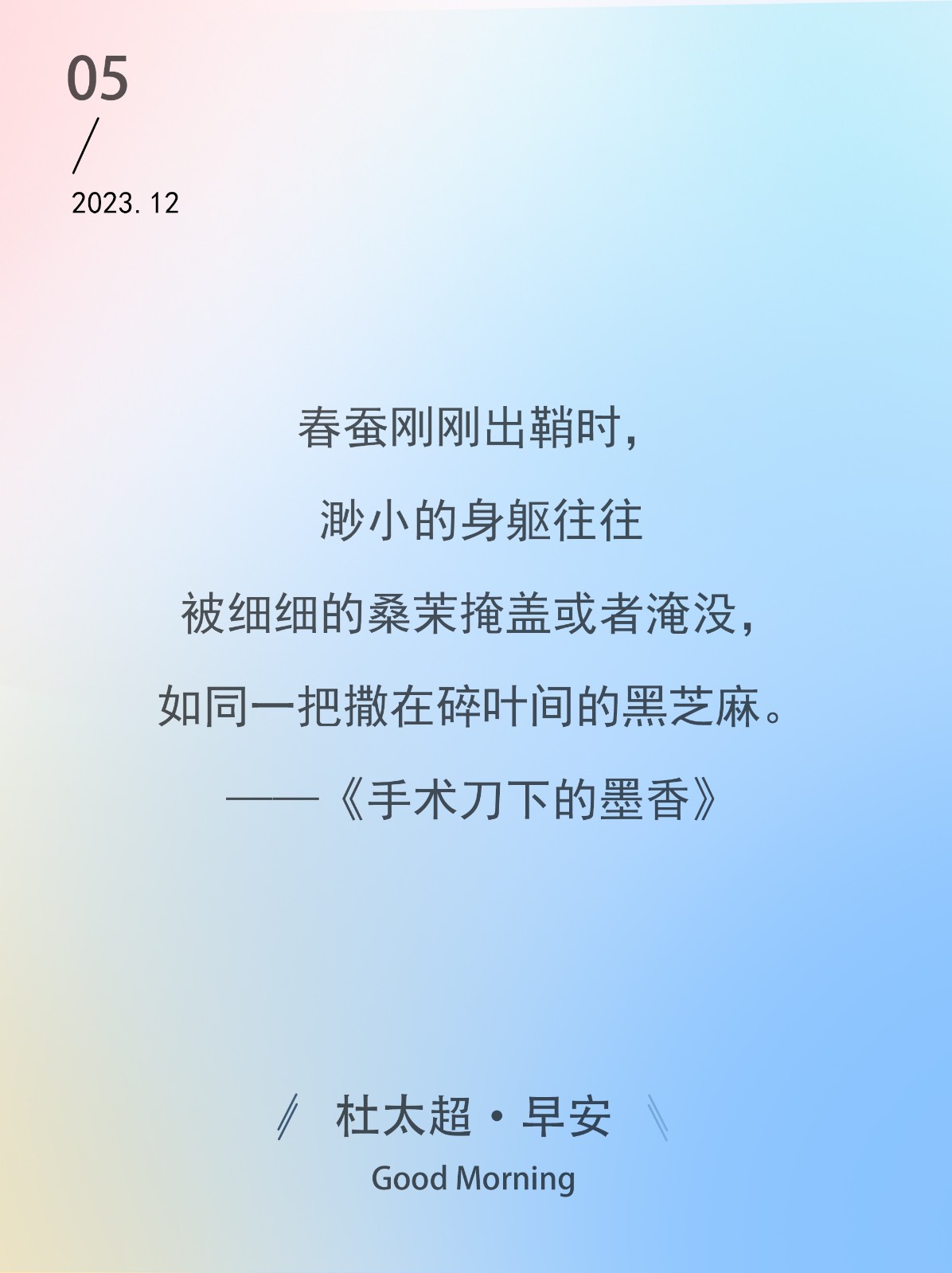 春蚕刚刚出鞘时,渺小的身躯往往被细细的桑茉掩盖或者淹没,如同一把撒在碎叶间的黑芝麻。——《手术刀下的墨香》