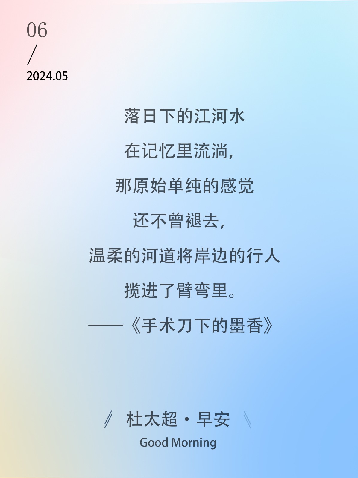 落日下的江河水在记忆里流淌,那原始单纯的感觉还不曾褪去,温柔的河道将岸边的行人揽进了臂弯里。——《手术刀下的墨香》