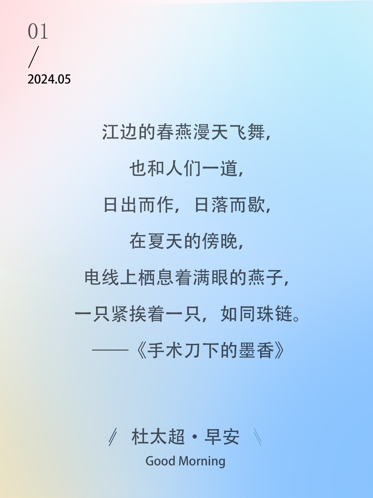 江边的春燕漫天飞舞,也和人们一道,日出而作,日落而歇,在夏天的傍晚,电线上栖息着满眼的燕子,一只紧挨着一只,如同珠链。——《手术刀...