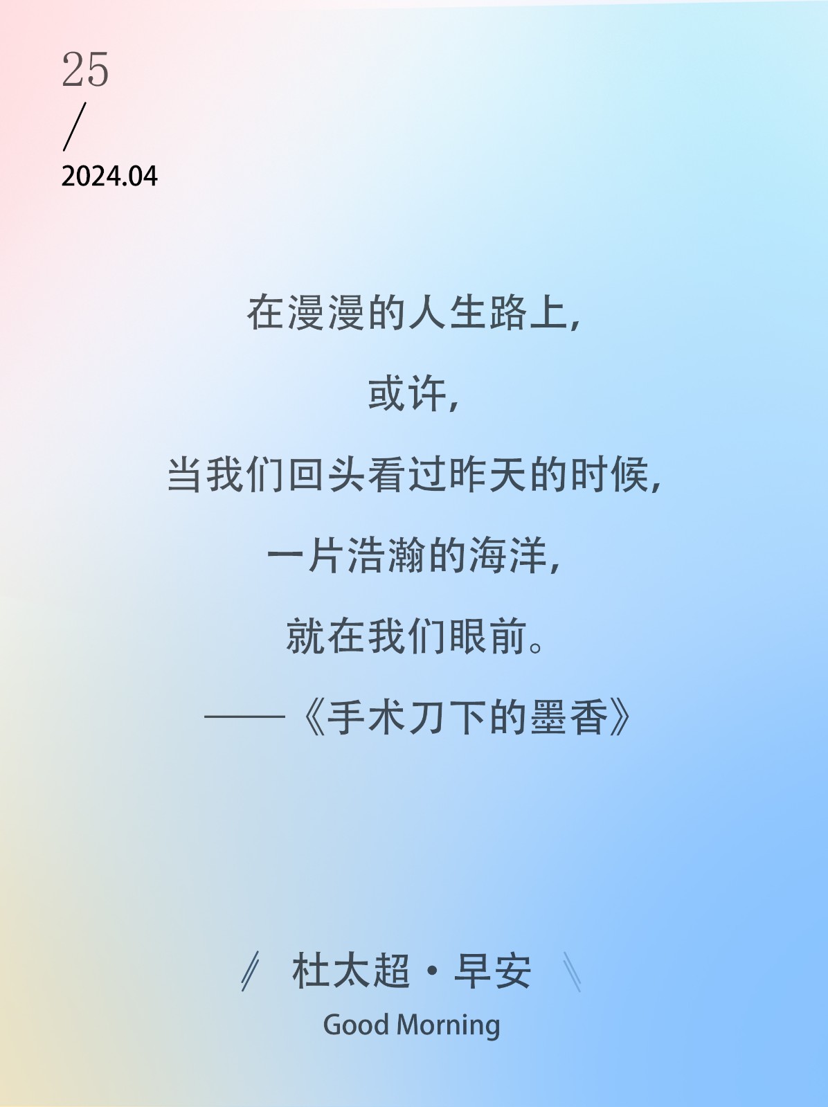 在漫漫的人生路上,或许,当我们回头看过昨天的时候,一片浩瀚的海洋,就在我们眼前。——《手术刀下的墨香》