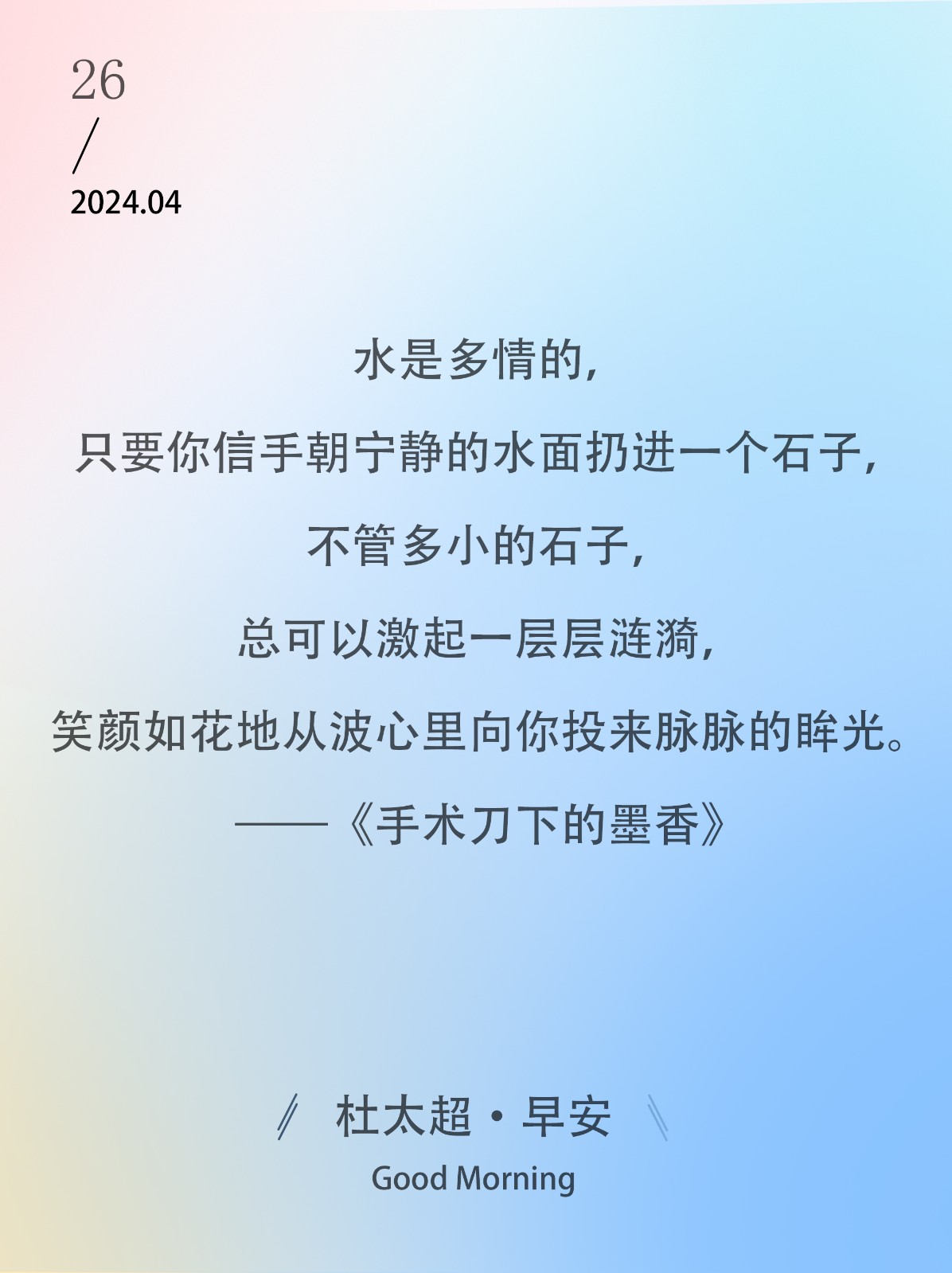 水是多情的,只要你信手朝宁静的水面扔进一个石子,不管多小的石子,总可以激起一层层涟漪,笑颜如花地从波心里向你投来脉脉的眸光。——《...
