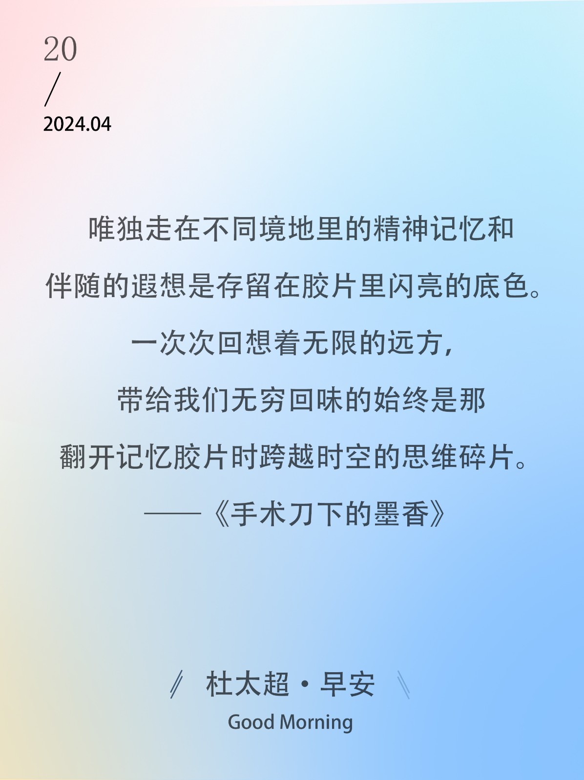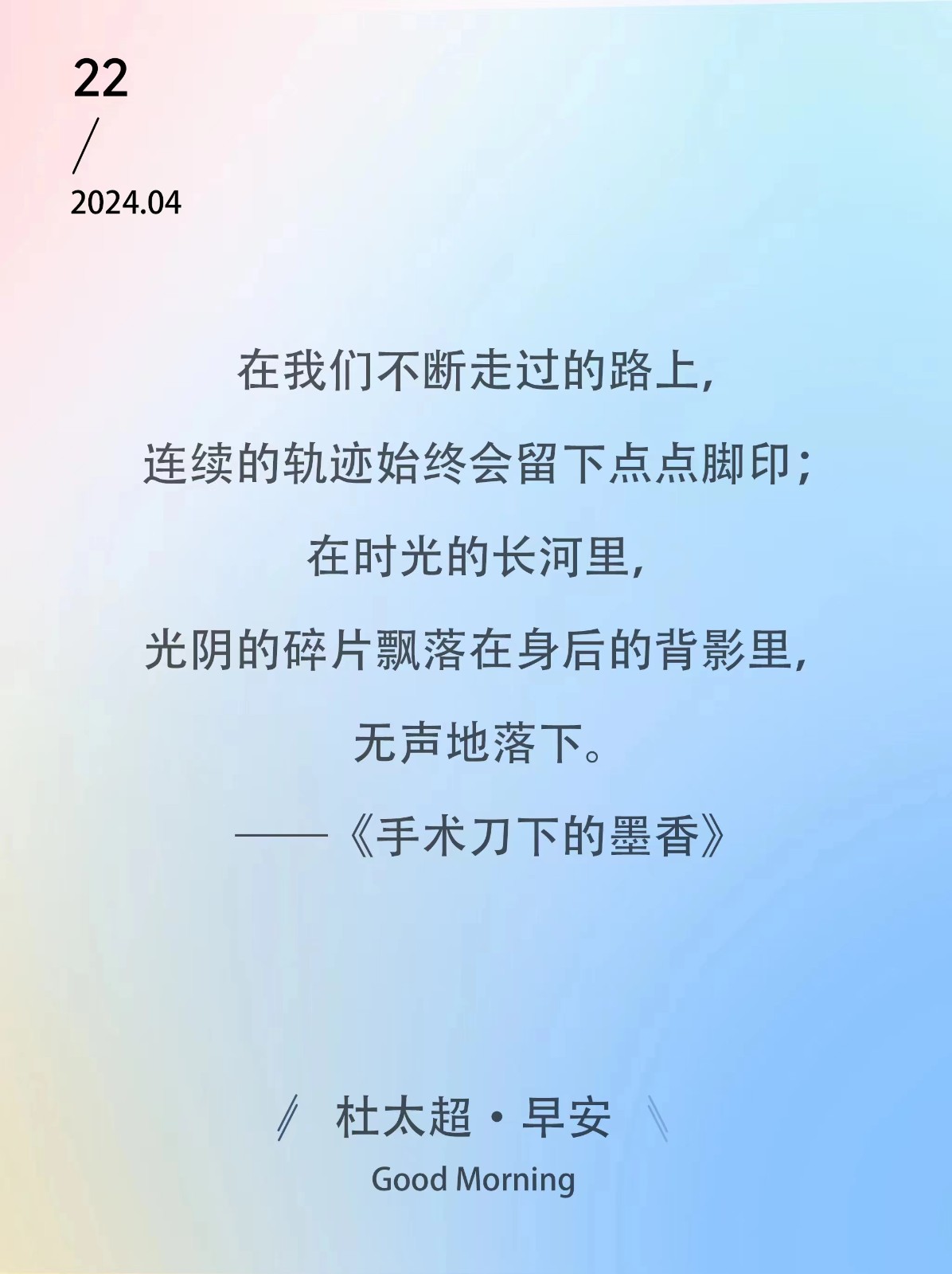 在我们不断走过的路上,连续的轨迹始终会留下点点脚印;在时光的长河里,光阴的碎片飘落在身后的背影里,无声地落下。——《手术刀下的墨香》