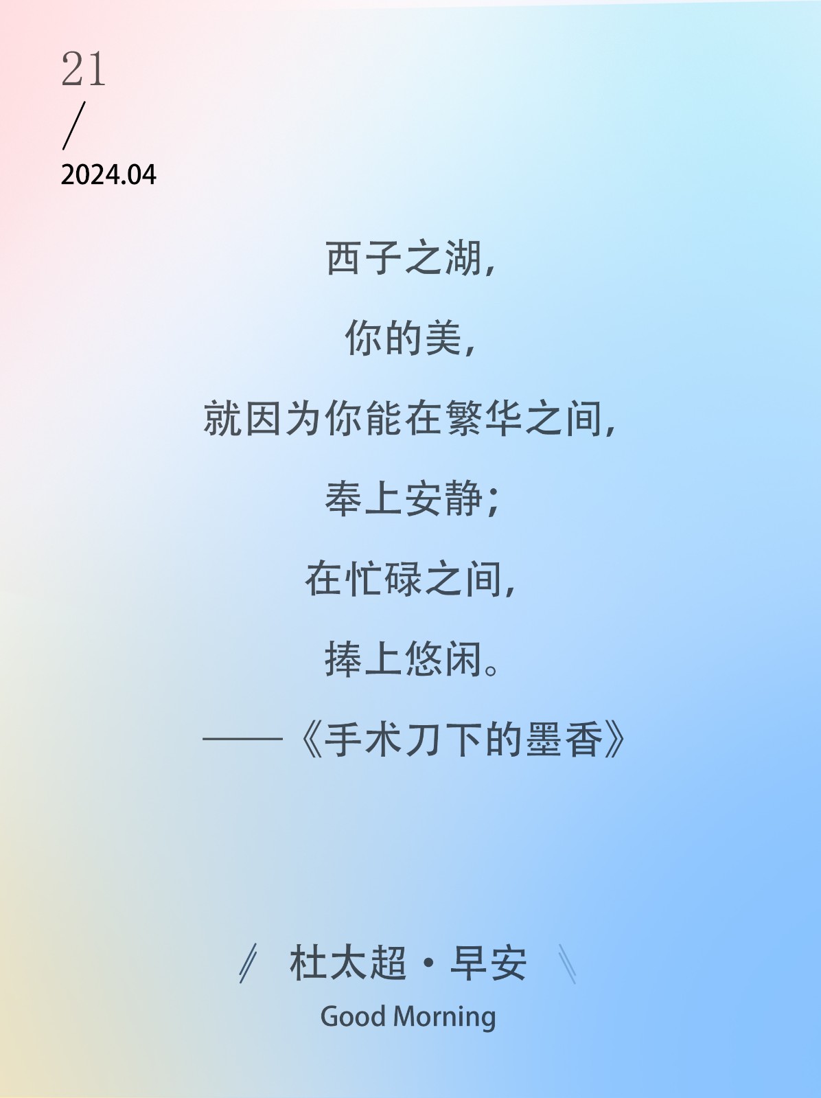 西子之湖,你的美,就因为你能在繁华之间,奉上安静;在忙碌之间,捧上悠闲。——《手术刀下的墨香》