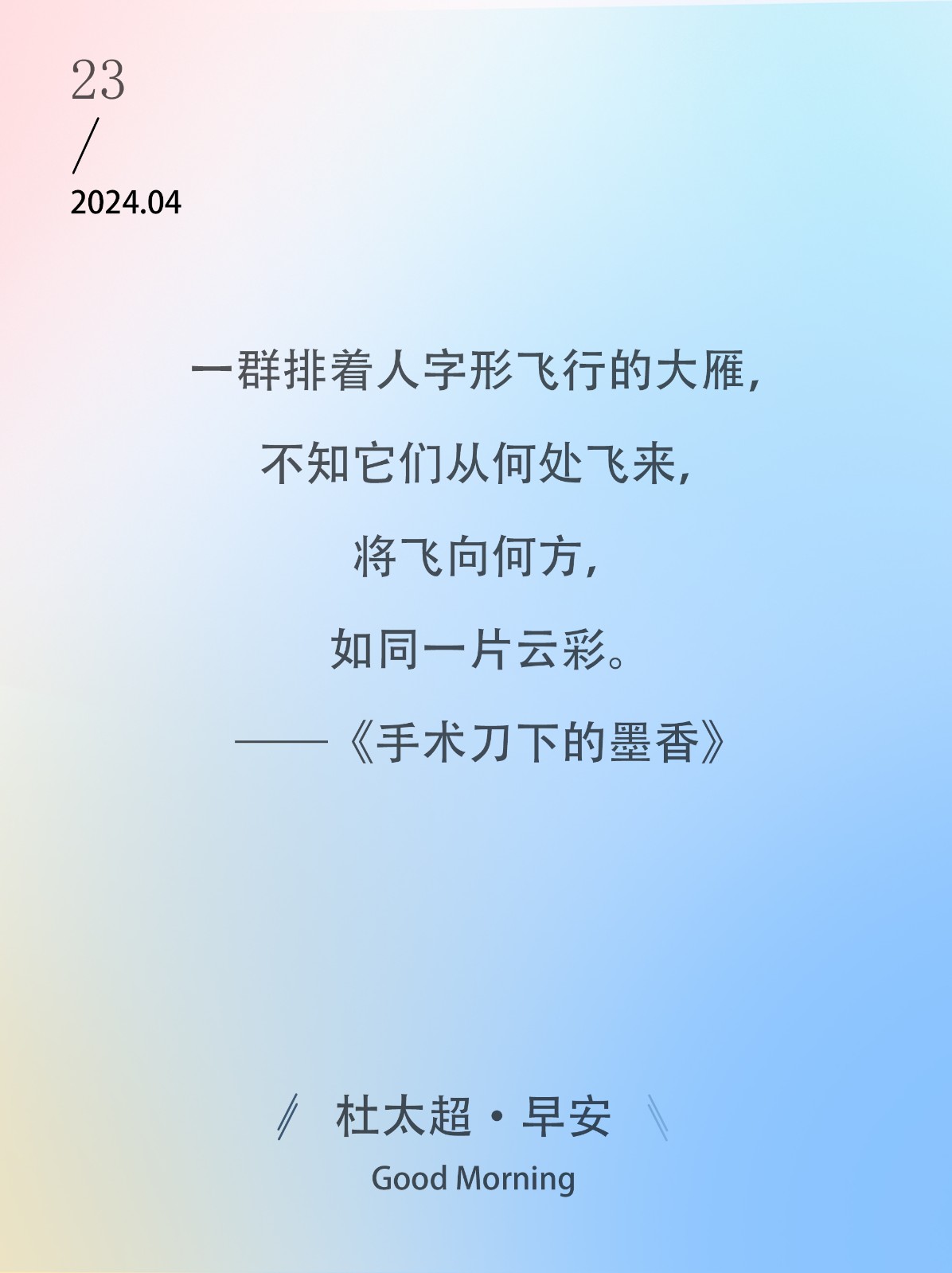 一群排着人字形飞行的大雁,不知它们从何处飞来,将飞向何方,如同一片云彩。——《手术刀下的墨香》